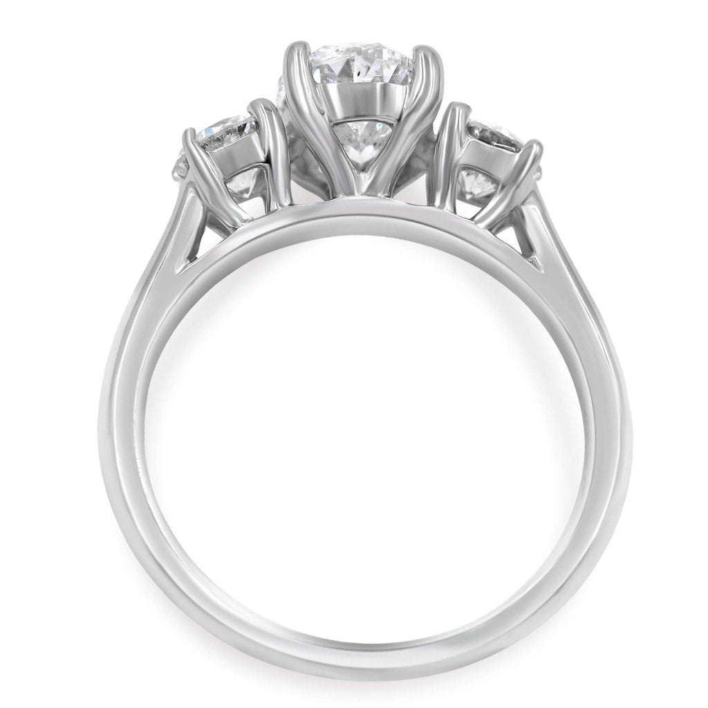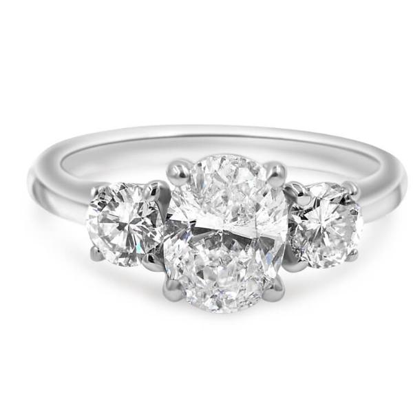 This beautiful engagement ring features a three stone design. The center diamond is an oval with one round stone on each side. It is a classy look with a modern twist.