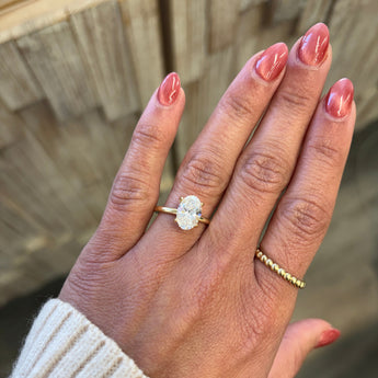 This beautiful engagement ring is the one and only classic Oval lab grown diamond 14K gold solitaire engagement ring. Brides love this solitaire engagement ring because you can mix and match any women's wedding wedding bands for the perfect stack.