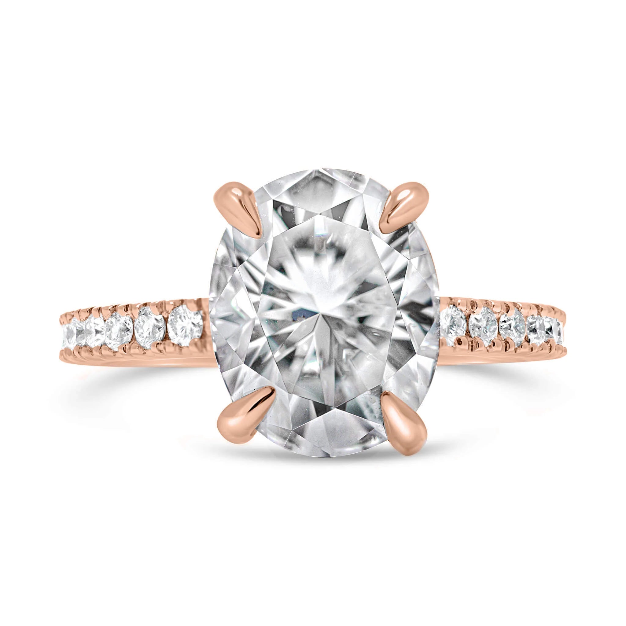 Delicate & timeless design. This unique engagement ring made with solid 14K gold features an oval center stone, with a pave band and a hidden halo.