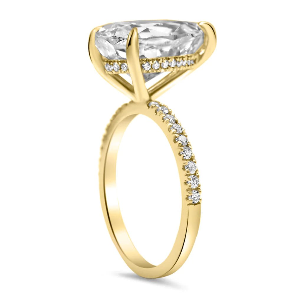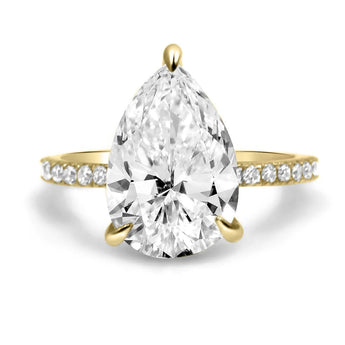Delicate & timeless design. This unique engagement ring made with solid 14K gold features a pear center stone, with a pave band and a hidden halo.