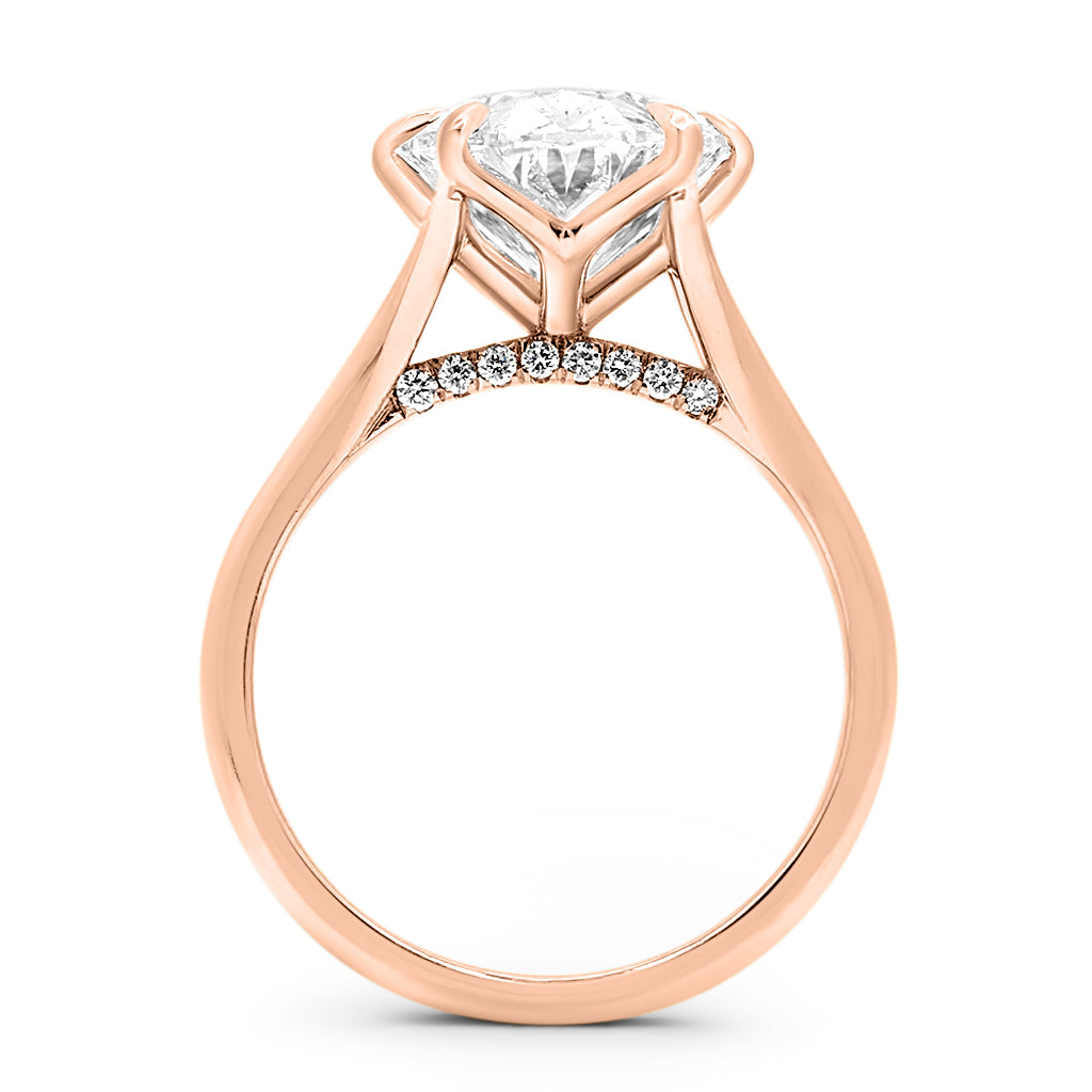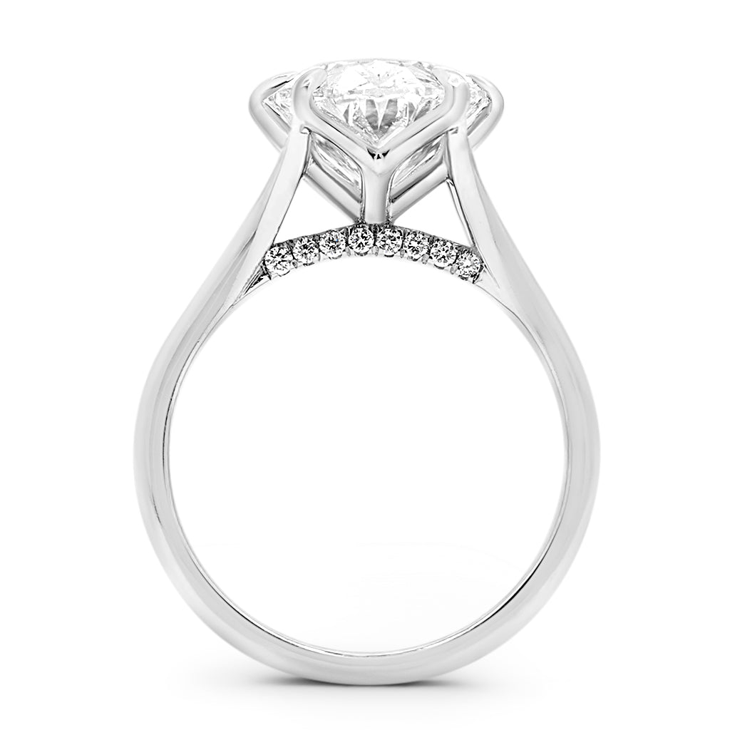 This beautiful engagement ring features a custom 2mm shank, cathedral setting with diamonds on the bridge. The ladies love it because it will sit flush with any wedding band that we have & it will always be a timeless look.