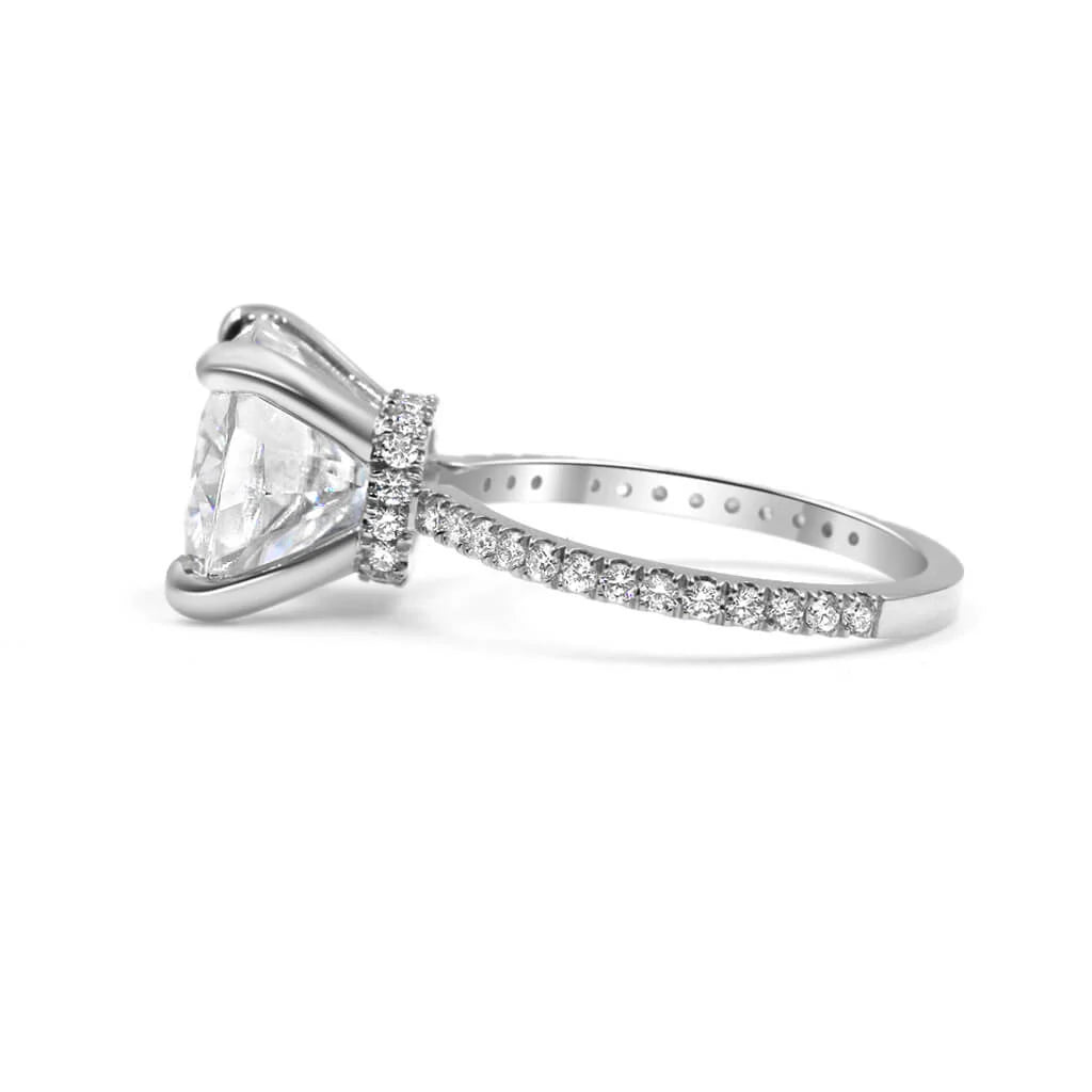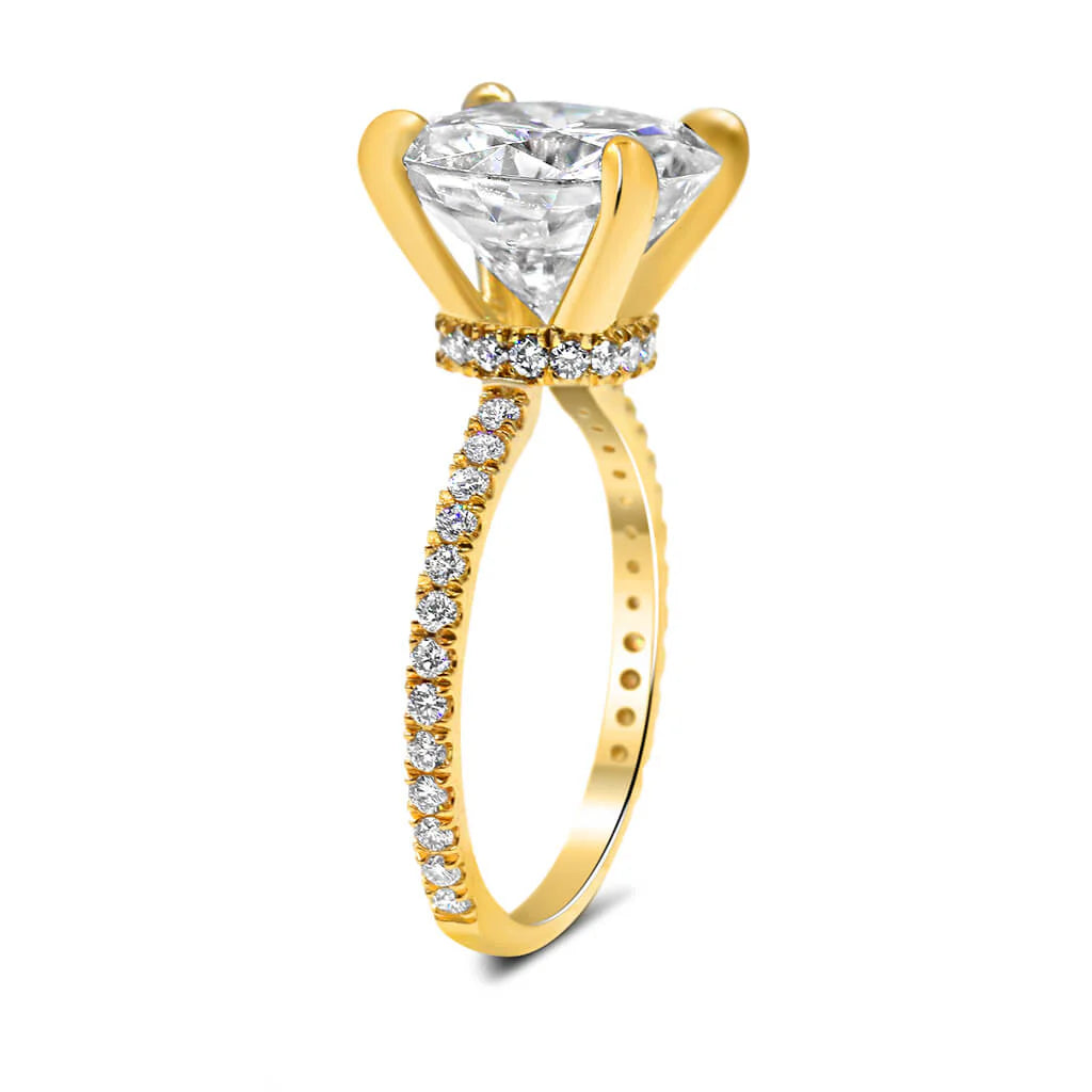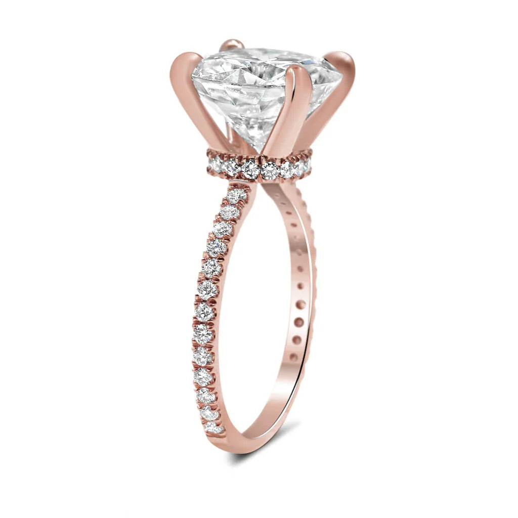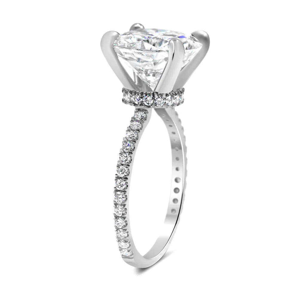 This beautiful setting is a one and only classic with a hidden halo and a pave band. You can't go wrong with this delicate design. It will always be timeless. Brides love this ring because you can mix and match any wedding band with it. The attention is all on her, that one of a kind center stone in your ring.