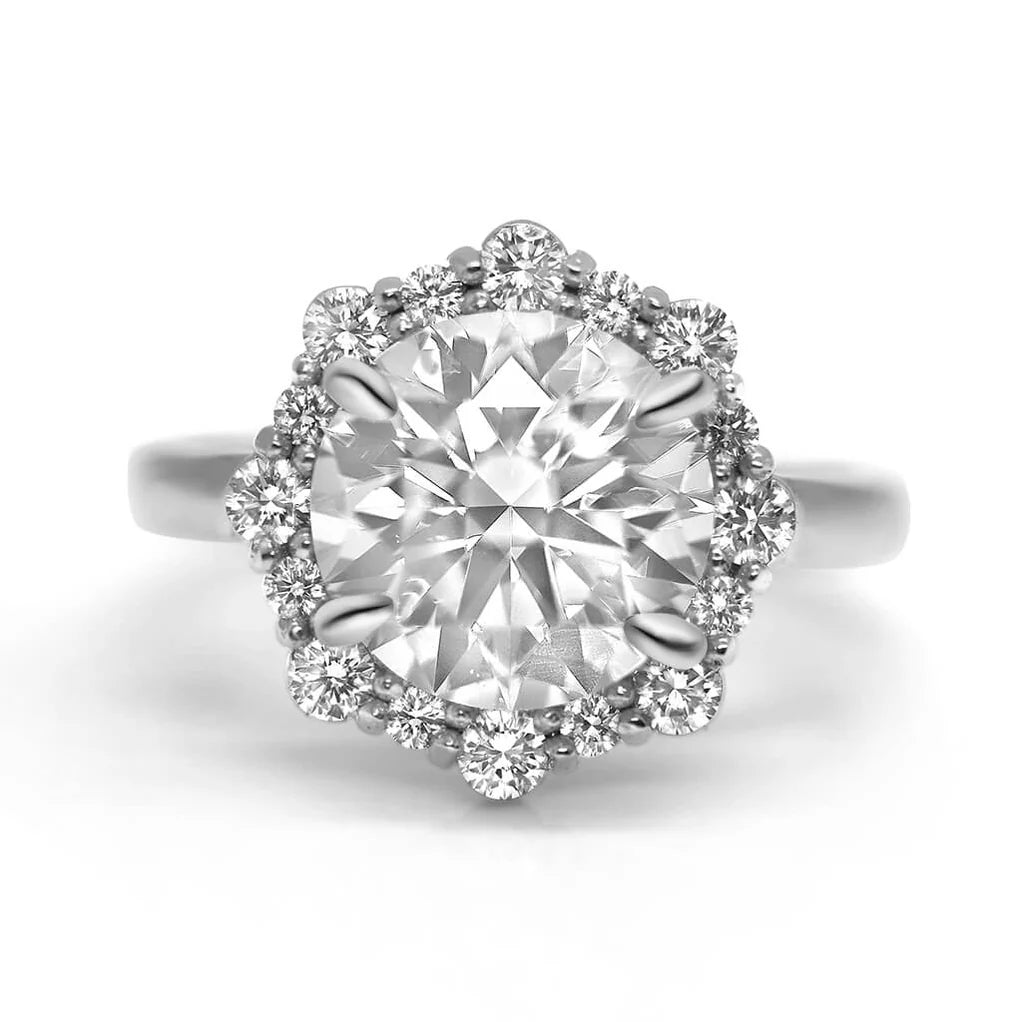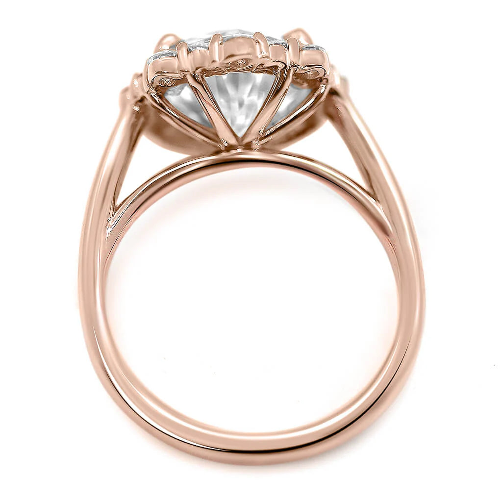 This ring features a beautiful halo around the center stone in a cathedral setting. You can't go wrong with this style, it is such a timeless look. Brides love this ring because you can mix and match any wedding band with it. The attention is all on her, that one of a kind center stone in your ring.