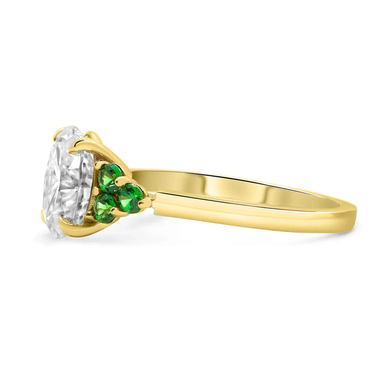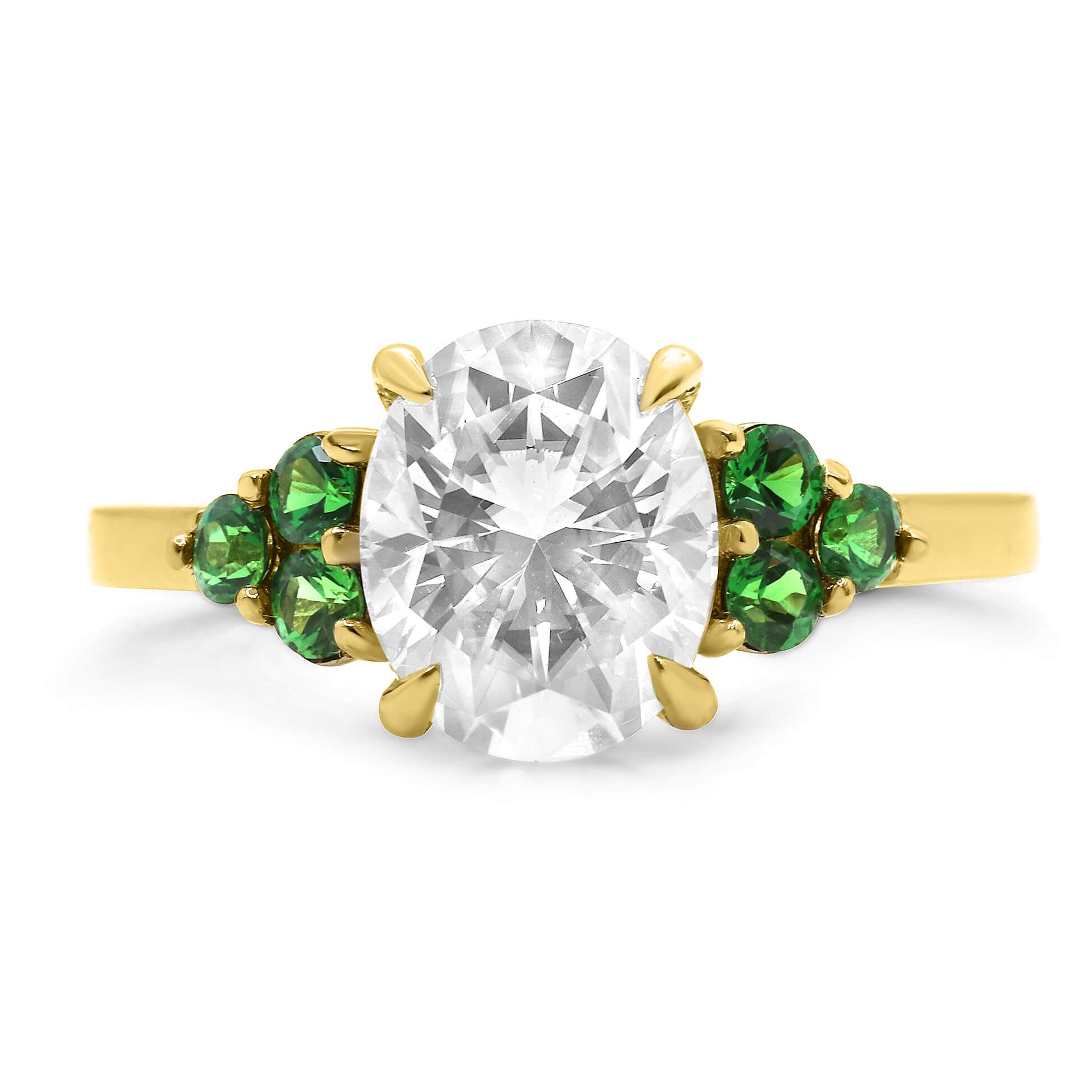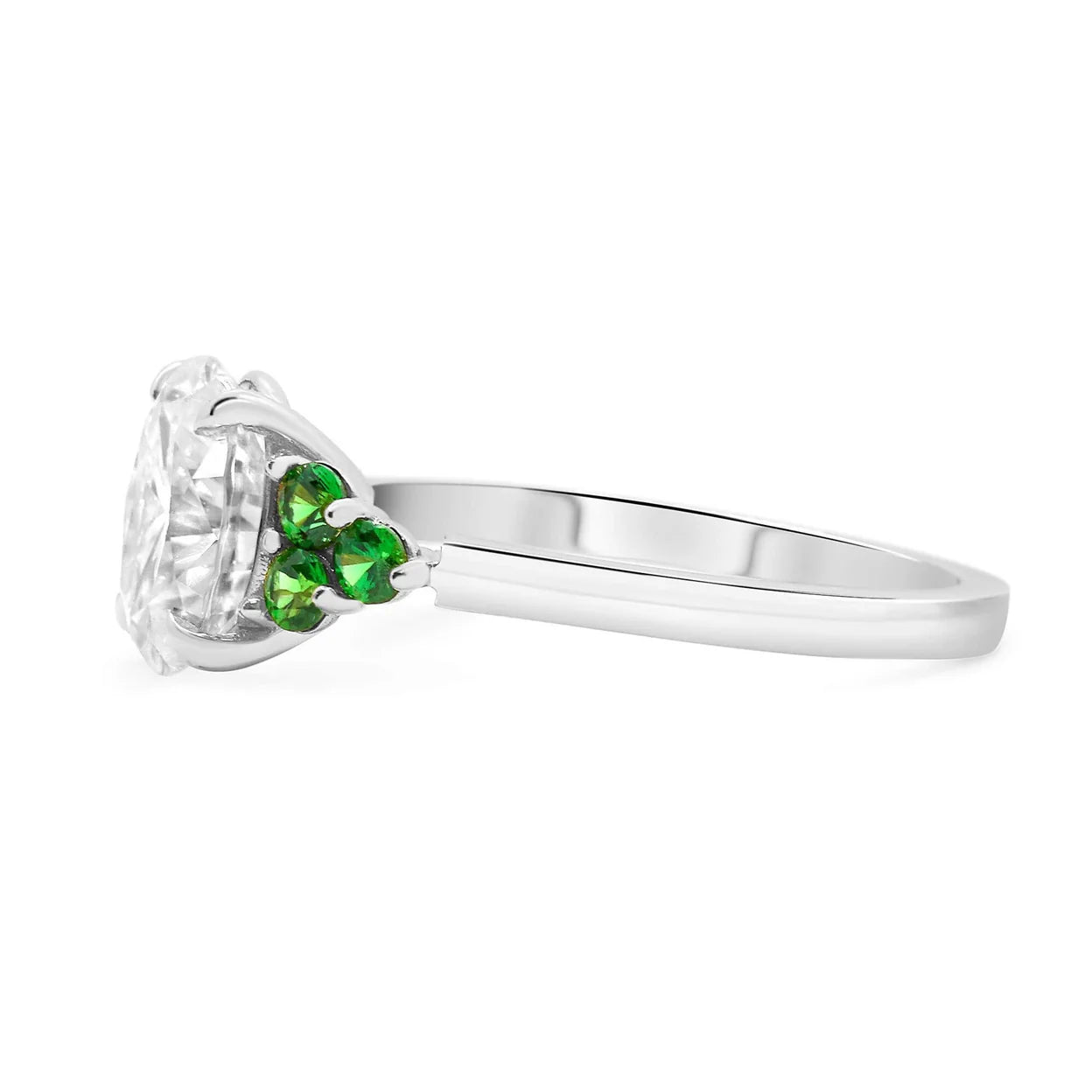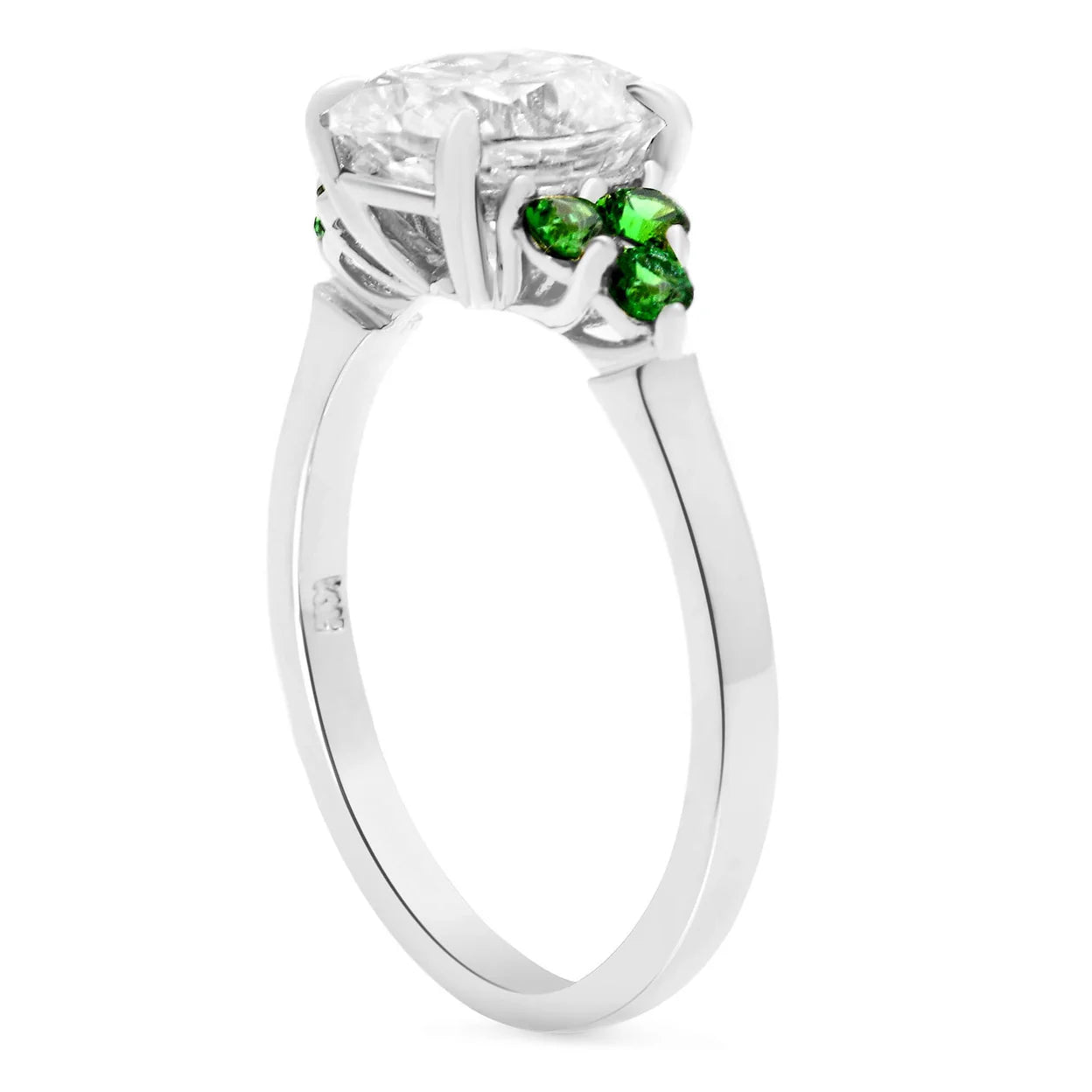 This beautiful setting is perfect for any center stone and features three tsavorites on each side. For a total of six tsavorites. Brides love this ring because of the vintage style & the beautiful green accent stones.