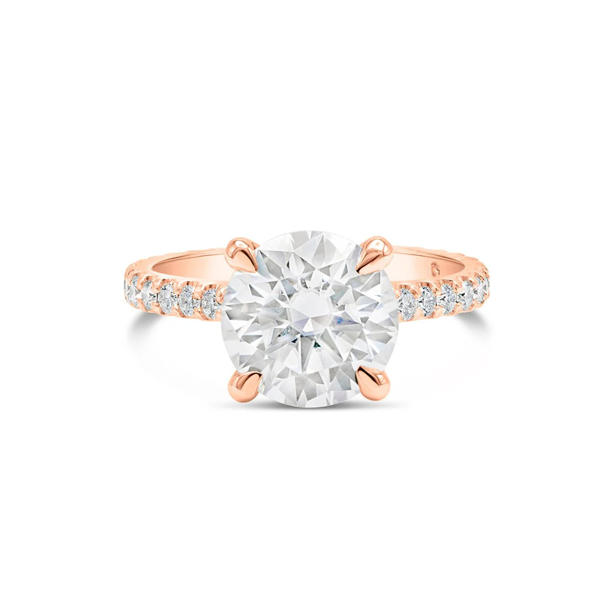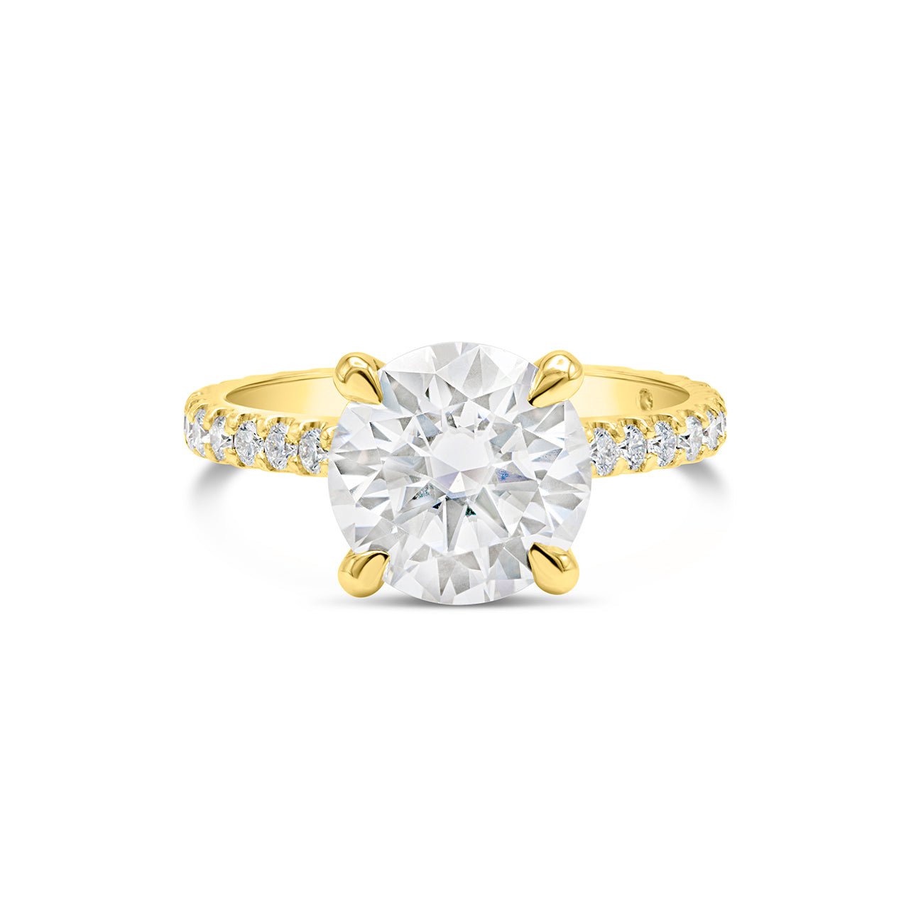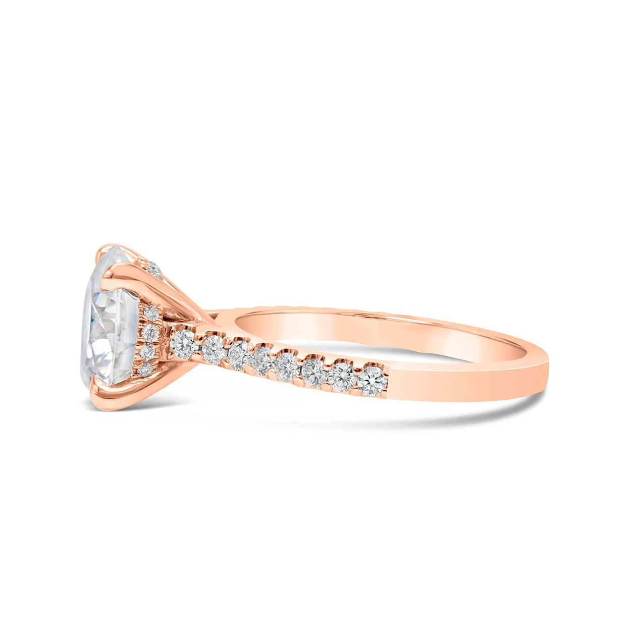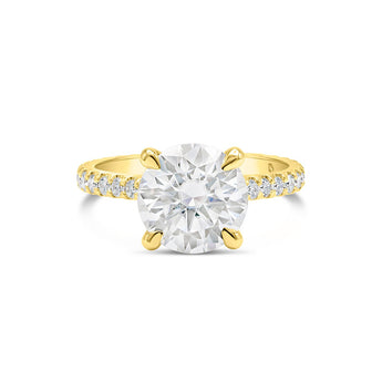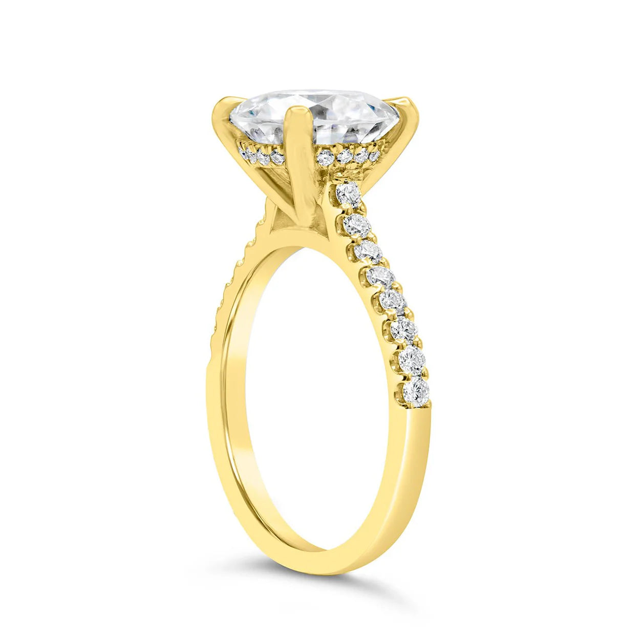 This unique engagement ring features a cathedral with a diamond hidden halo & accent diamonds shank, all in 14K gold. You can't go wrong with this style, it is such a timeless look. Brides love this ring because you can mix and match any wedding band with it.