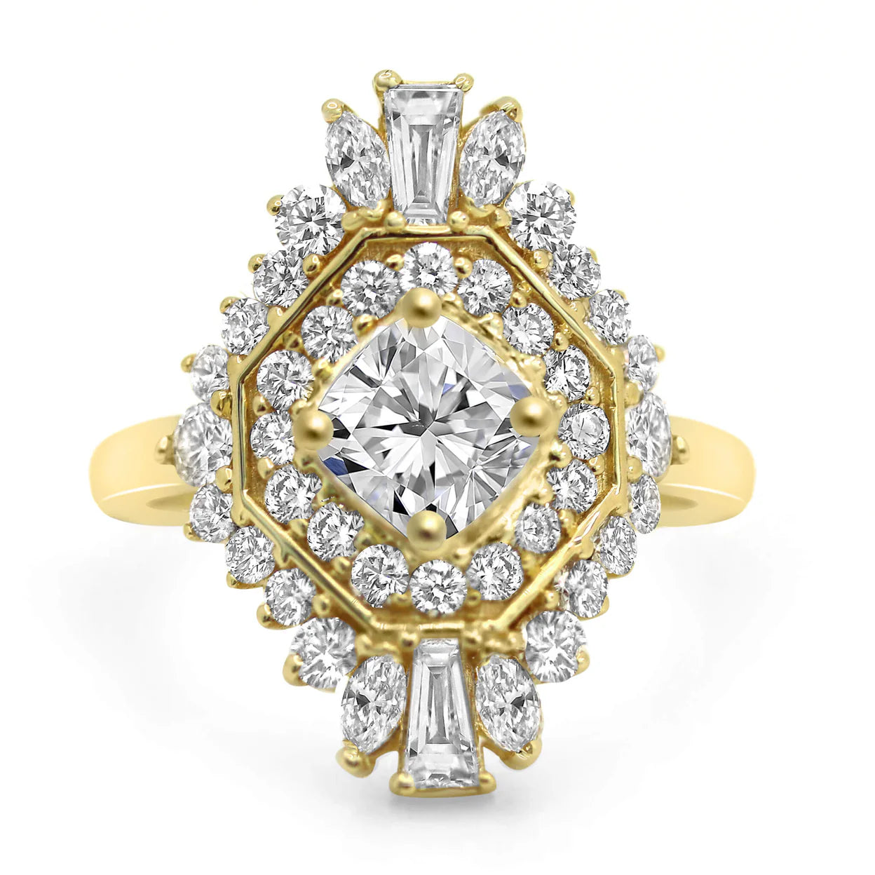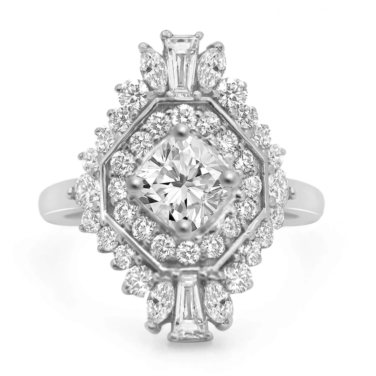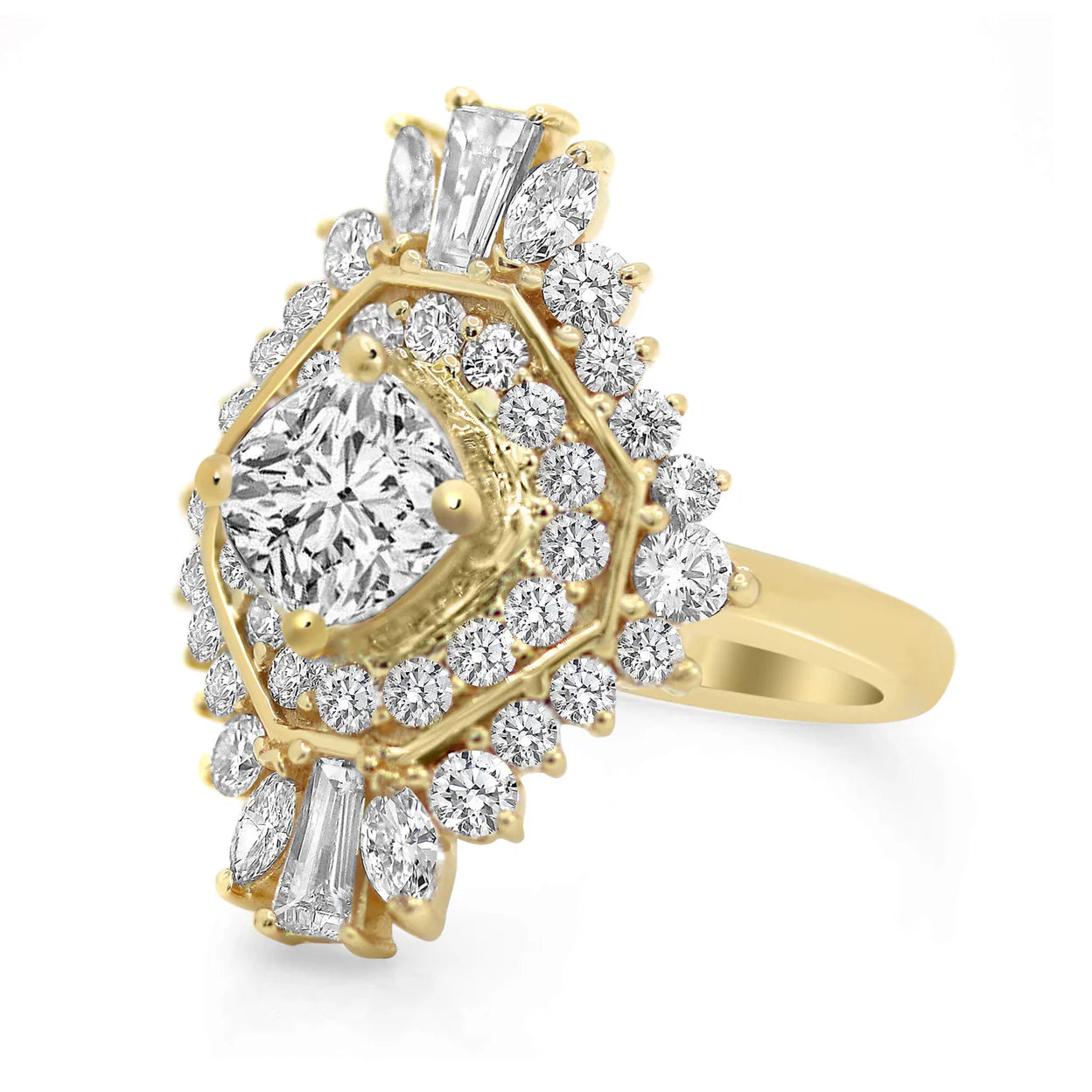 This ring features tapered baguettes, marquee cuts, and round brilliant accent stones. Perfect for our boho, vintage style lovers.