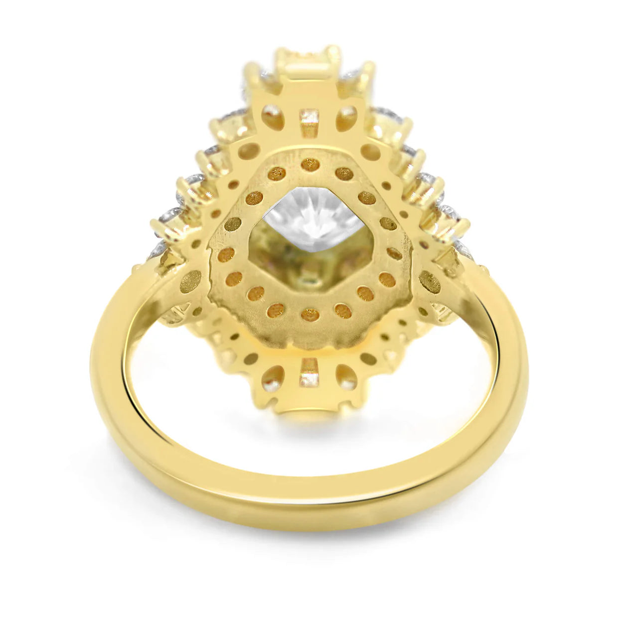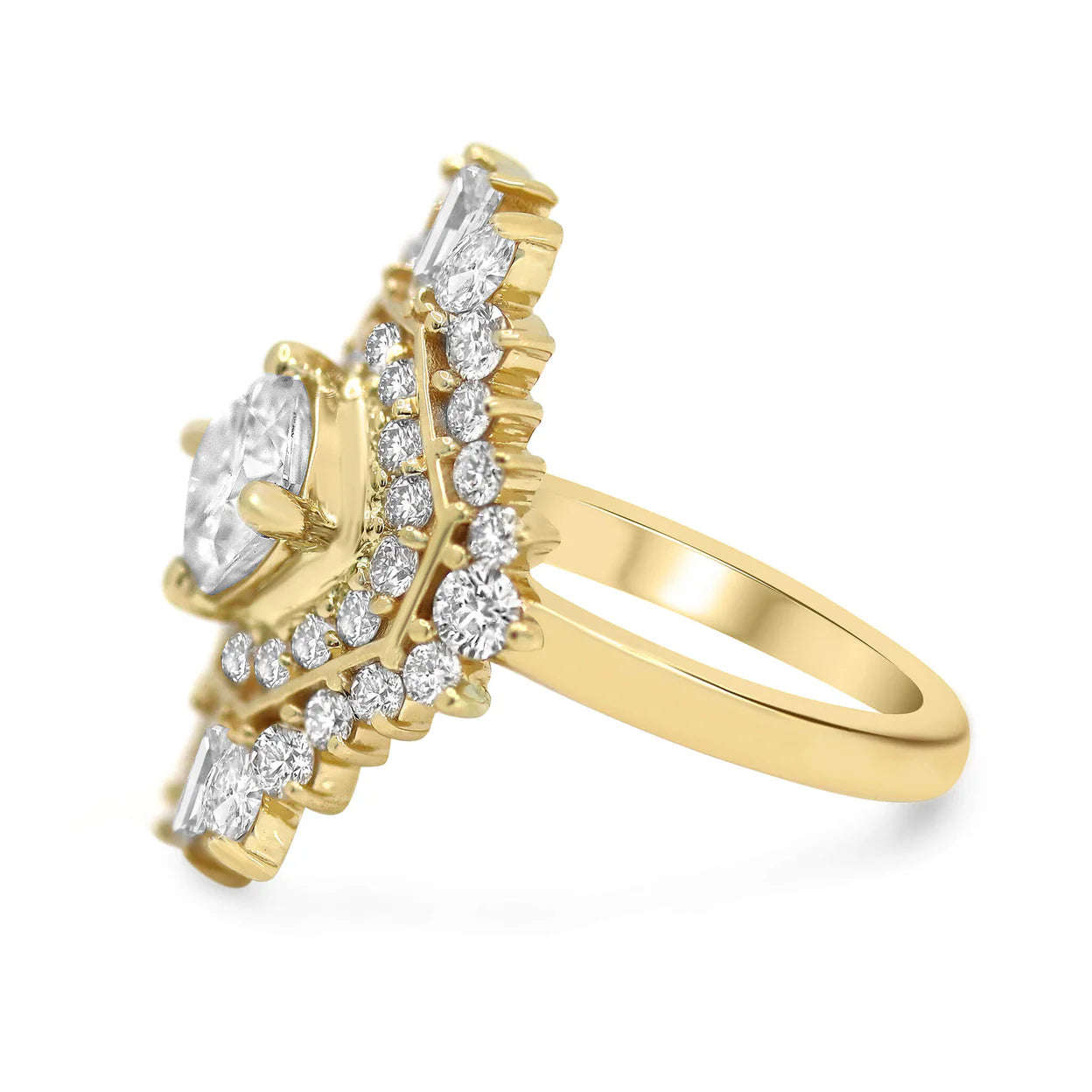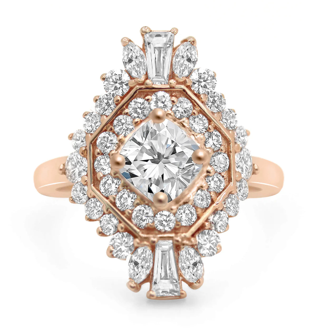 This ring features tapered baguettes, marquee cuts, and round brilliant accent stones. Perfect for our boho, vintage style lovers.