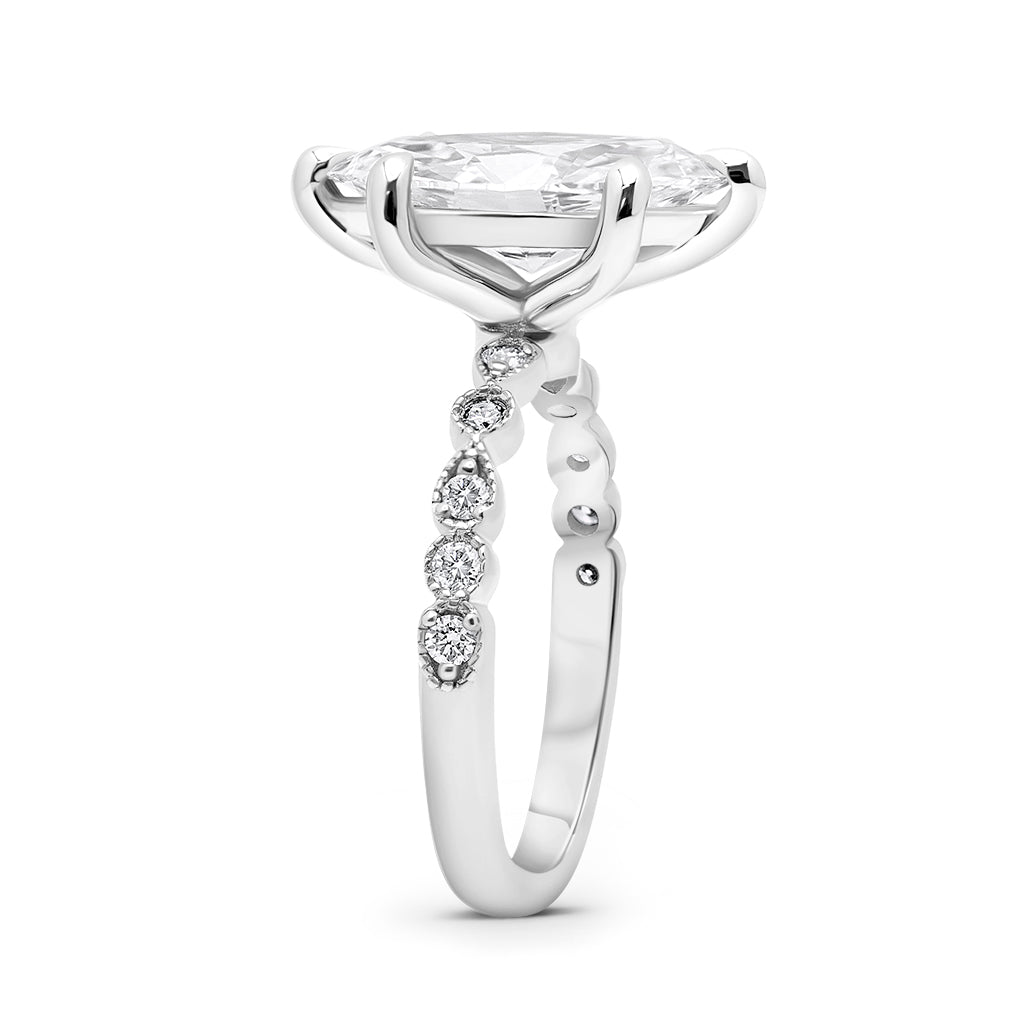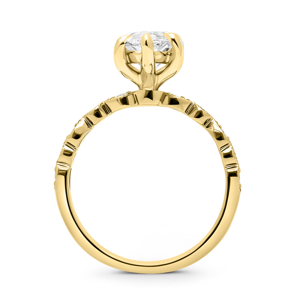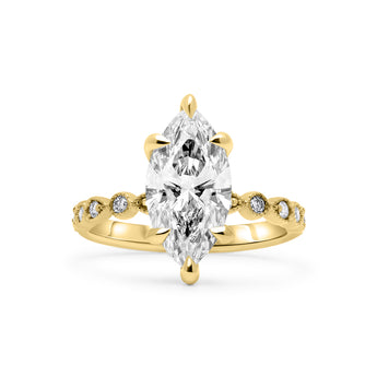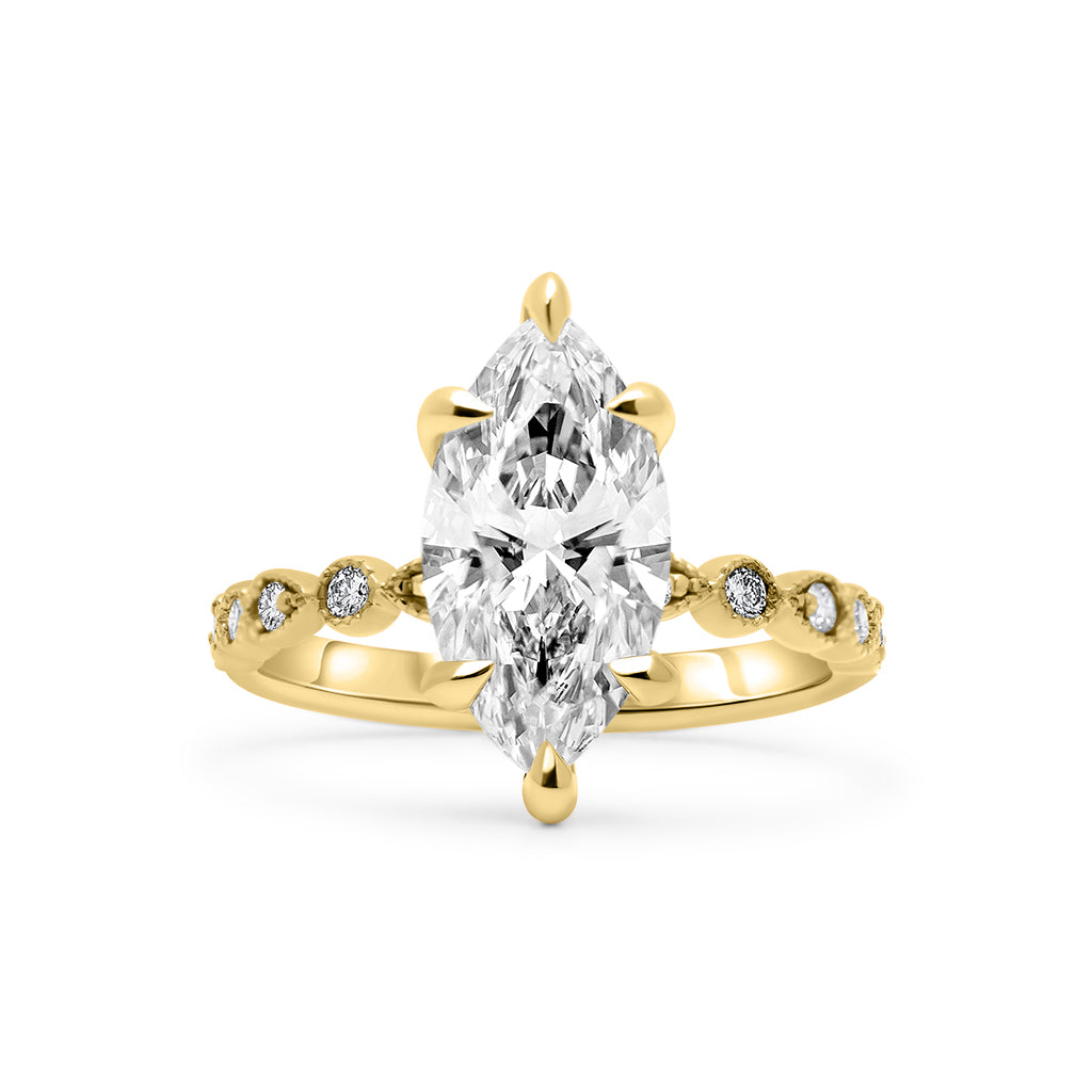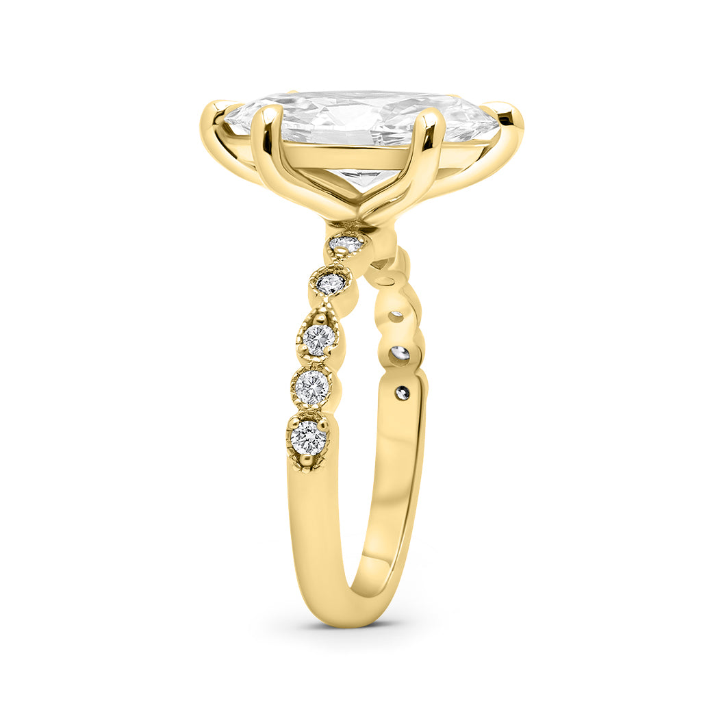 This ring features milgrain on the shank with lab grown diamond accent stones with a white gold head and yellow gold shank. You can't go wrong with this delicate design. It will always be timeless.