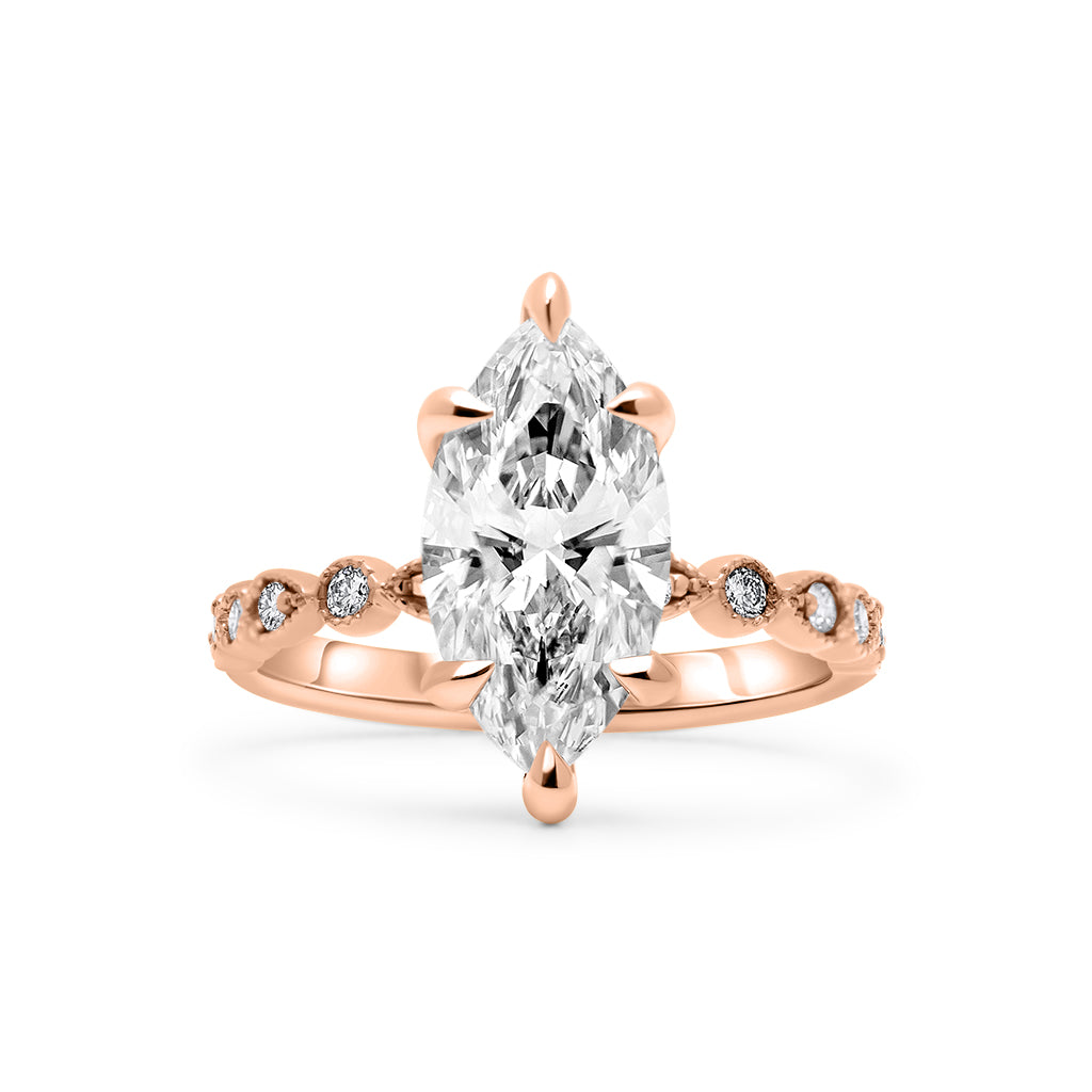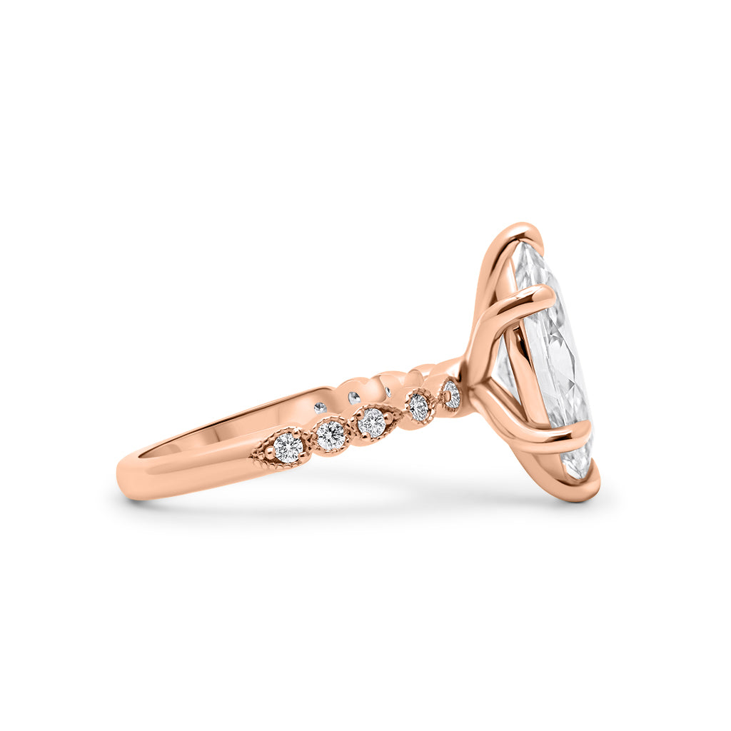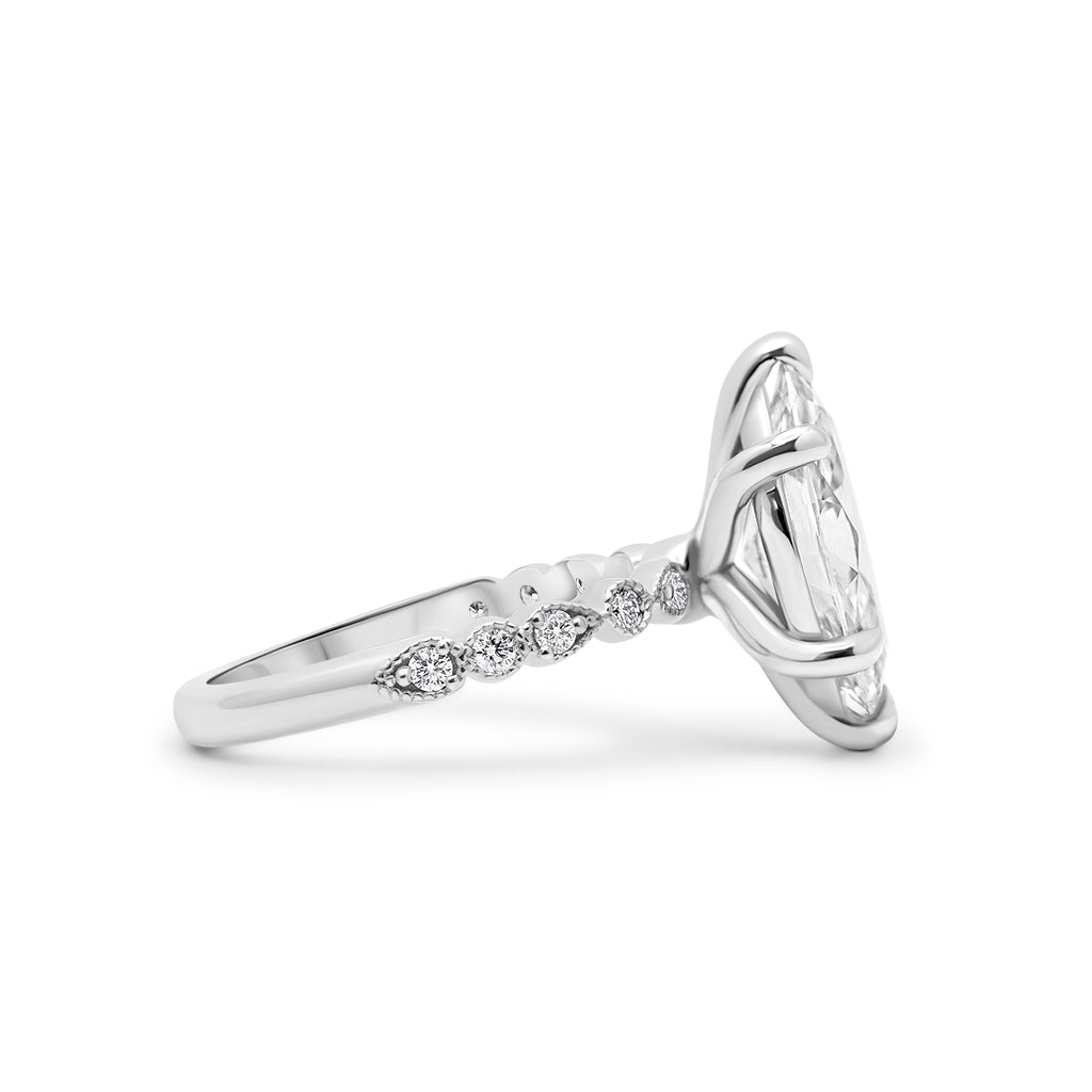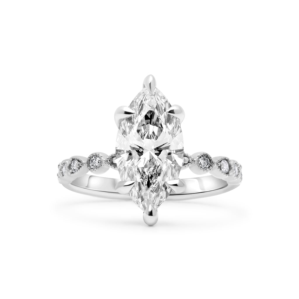 This ring features milgrain on the shank with lab grown diamond accent stones with a white gold head and yellow gold shank. You can't go wrong with this delicate design. It will always be timeless.