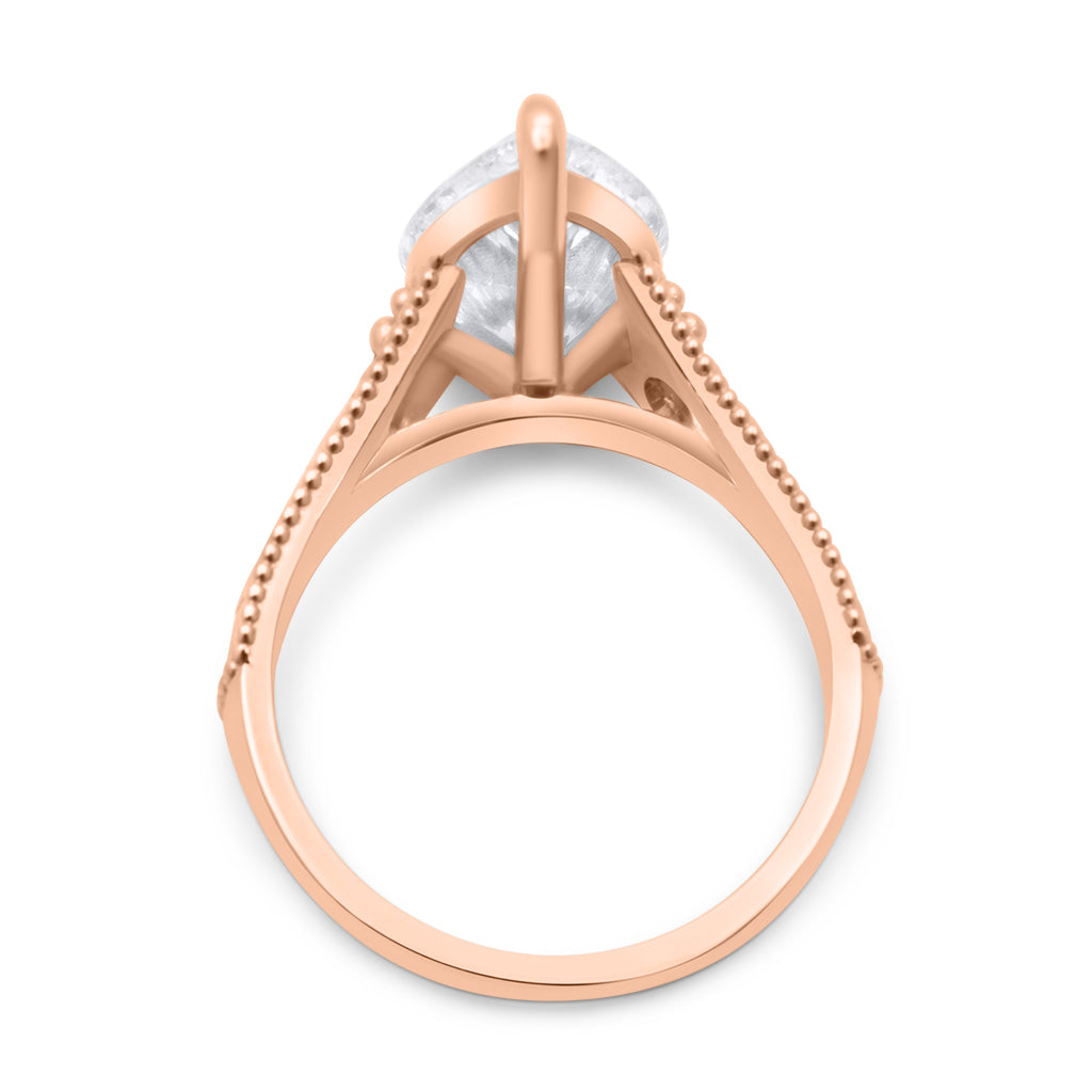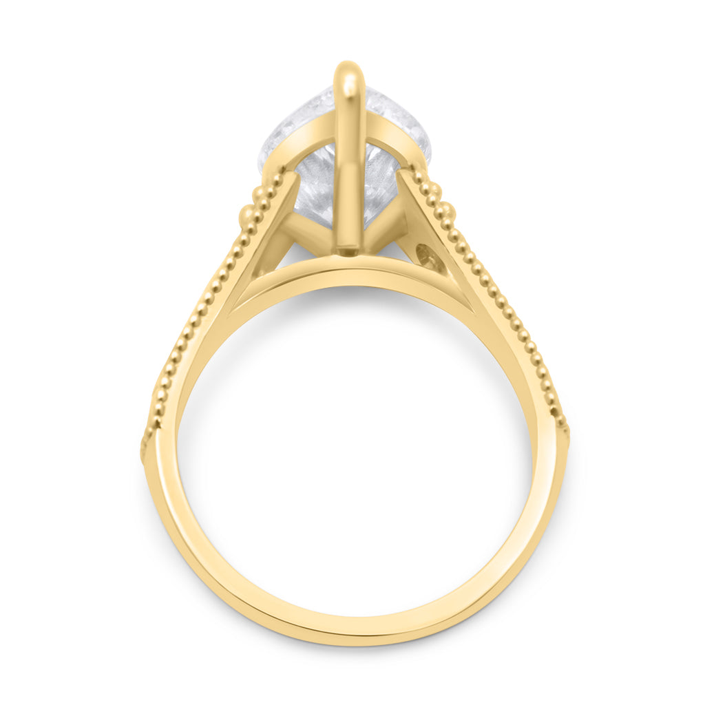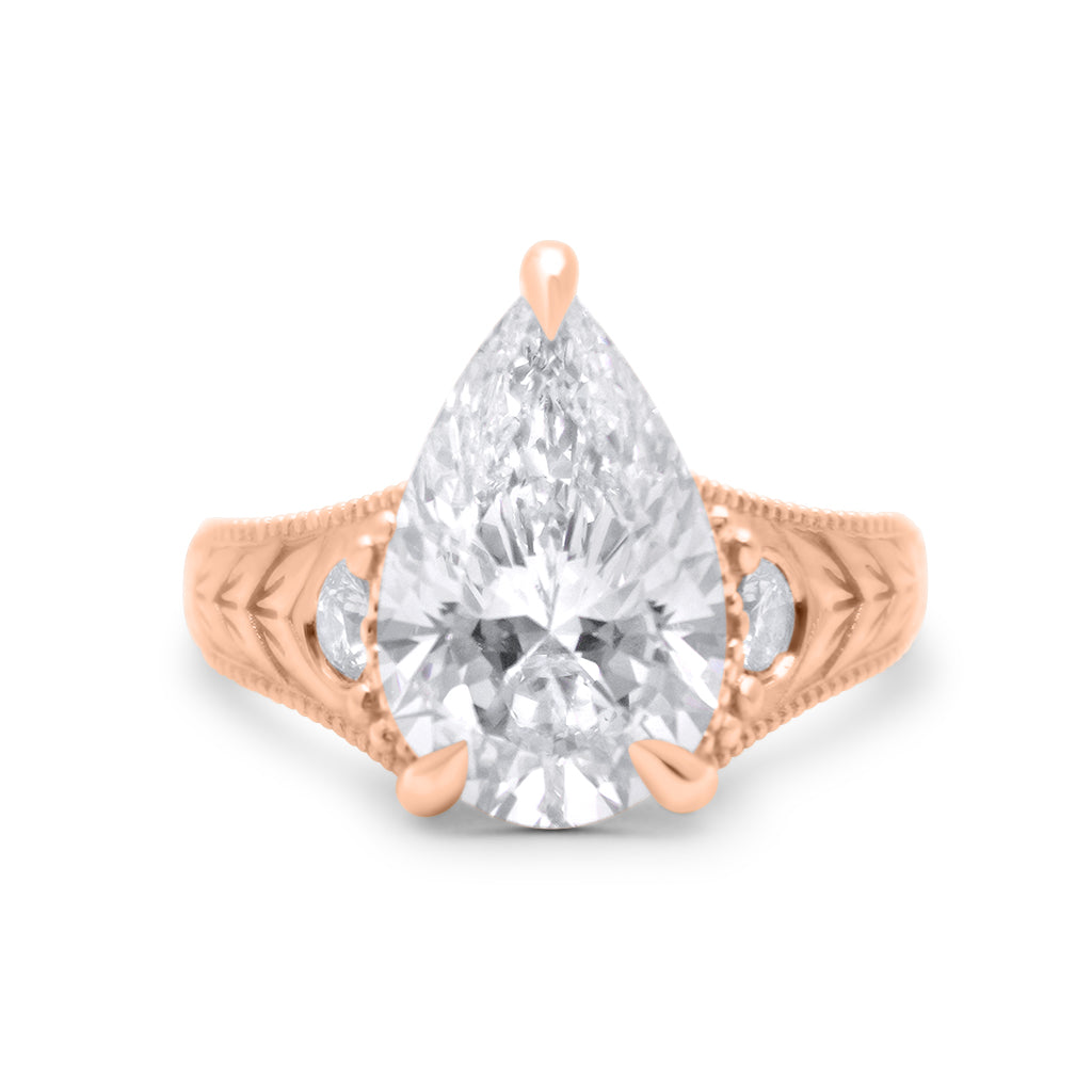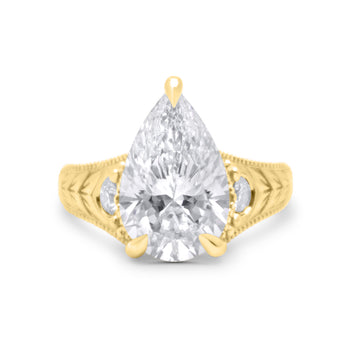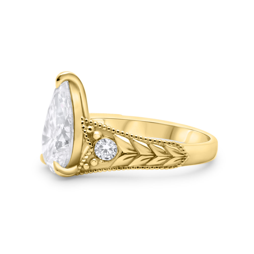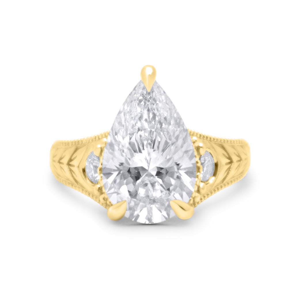 This beautiful engagement ring is the one and only classic 14K gold engagement ring it features chevron engraving on the shank with two round lab grown diamonds on the side. Brides love this engagement ring because it is such a beautiful design with a vintage modern twist.