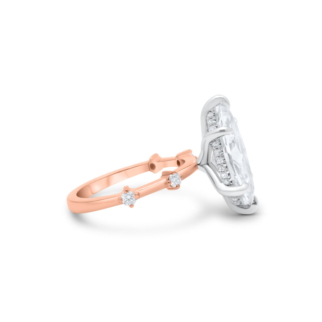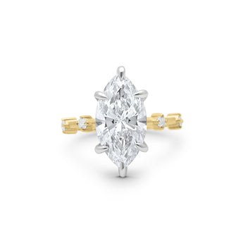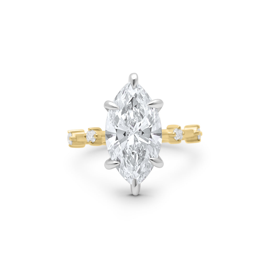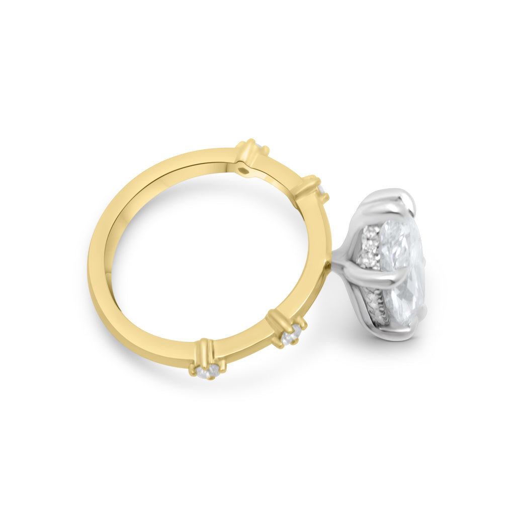 Meet our beautiful 14K gold hidden halo engagement ring with accent stones that are spaced out throughout the band. You can't go wrong with this delicate design. It will always be timeless. Brides love this ring because you can mix and match any women's diamond wedding band This setting features a white gold head with a yellow gold shank.
