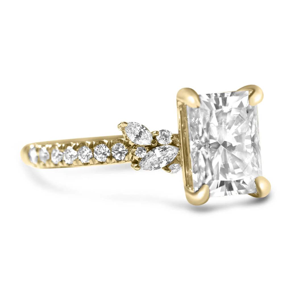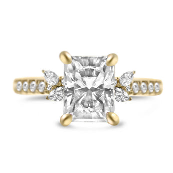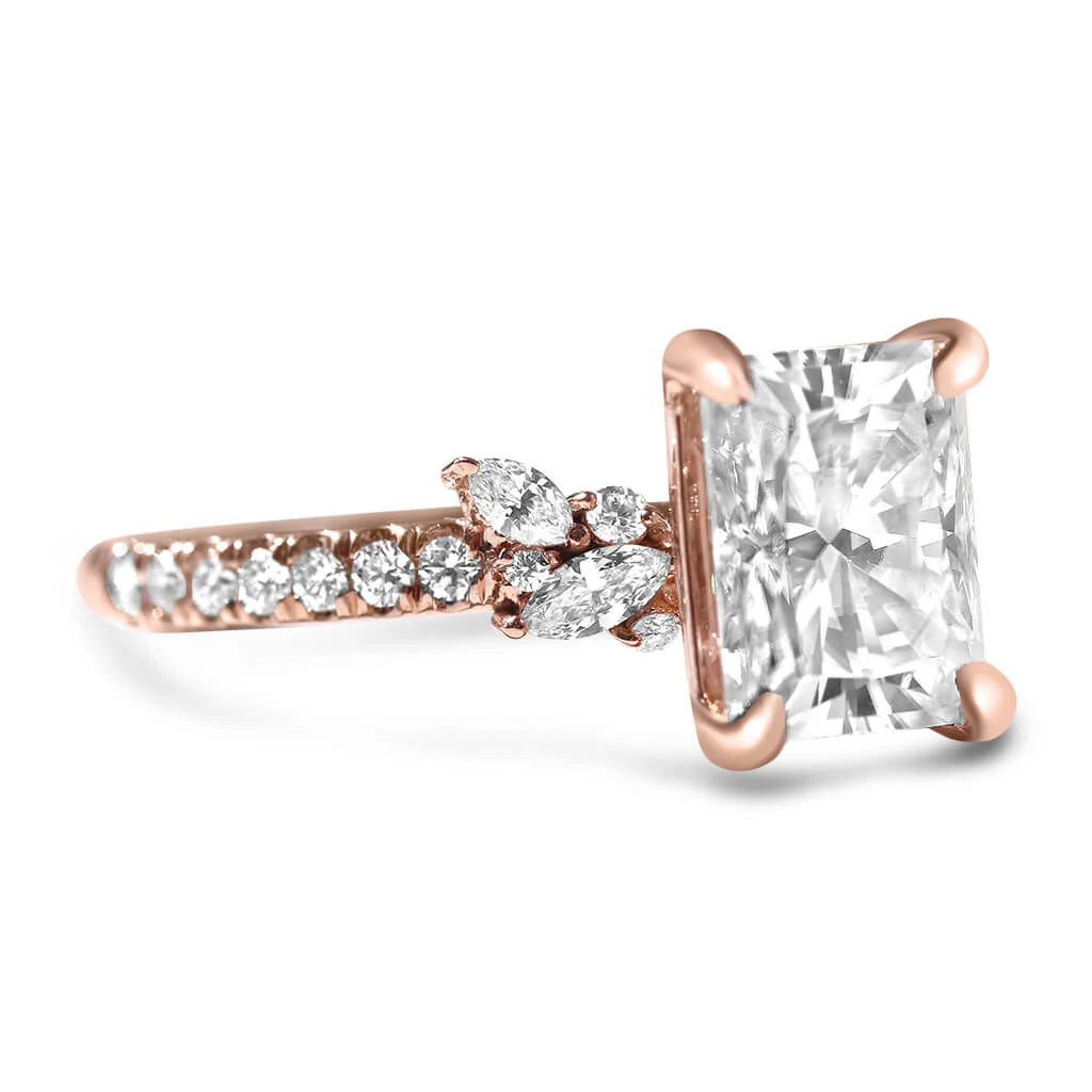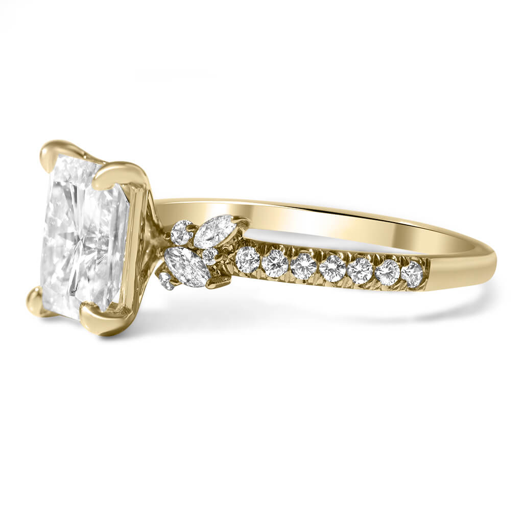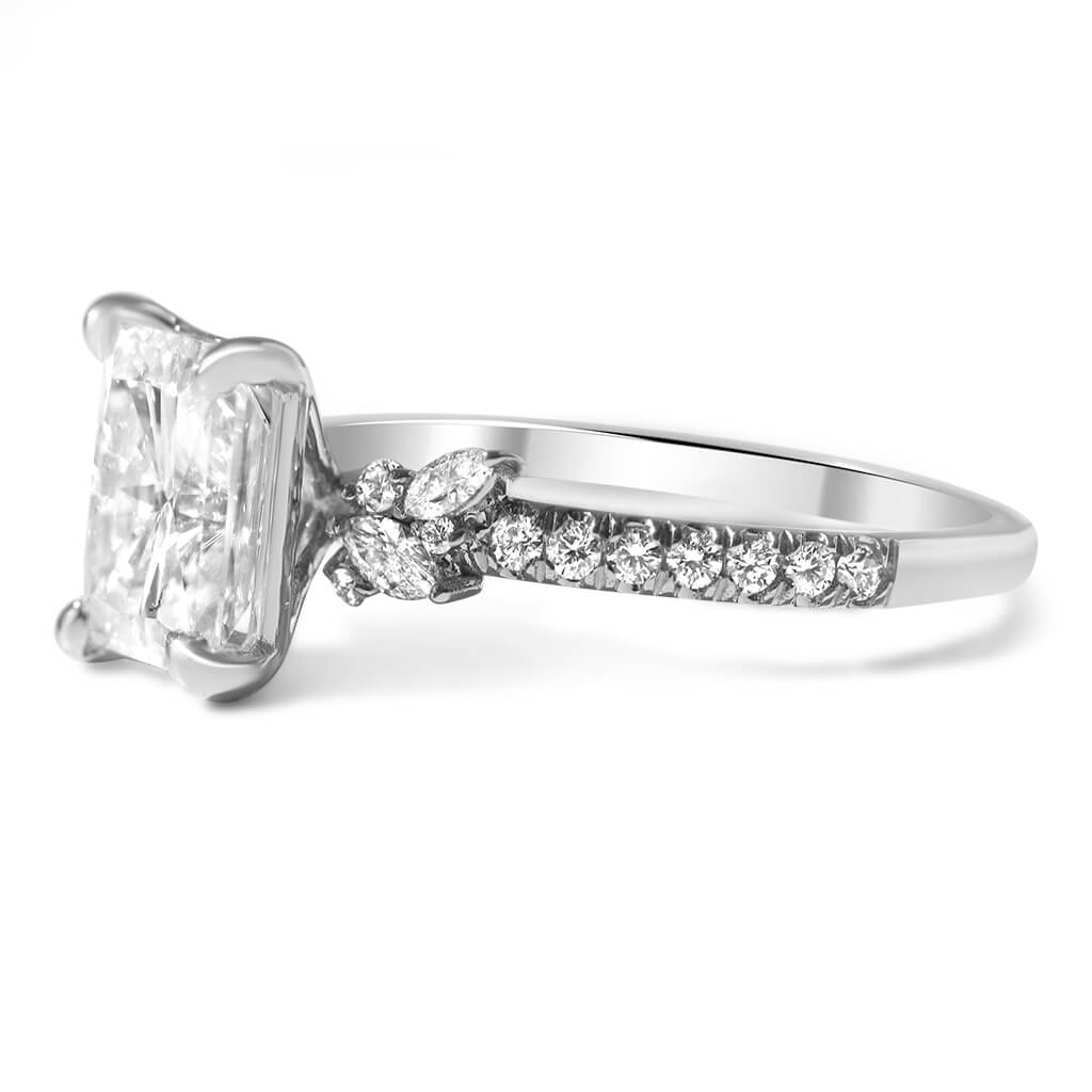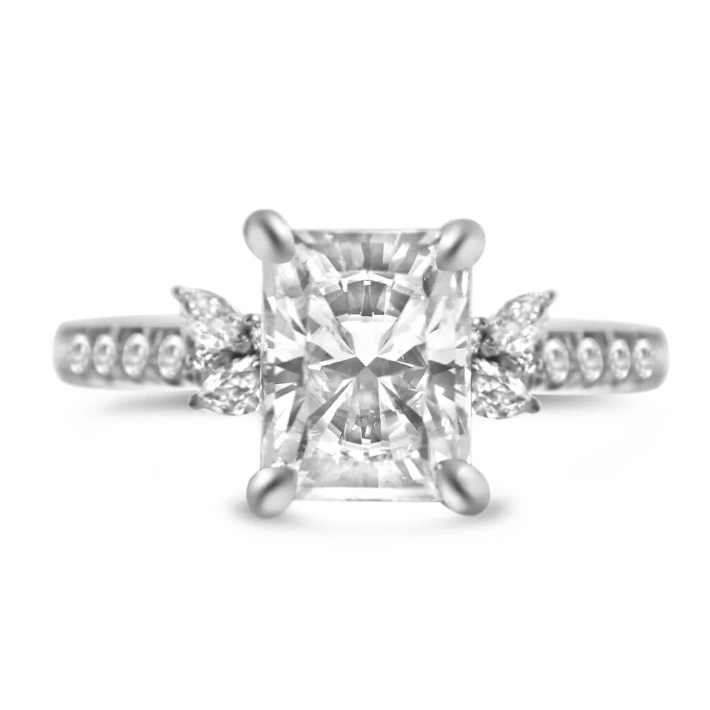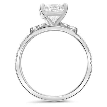 This beautiful setting is thand only radiant engagement ring with accent stones on the band. You can't go wrong with this delicate design. It will always be timeless.