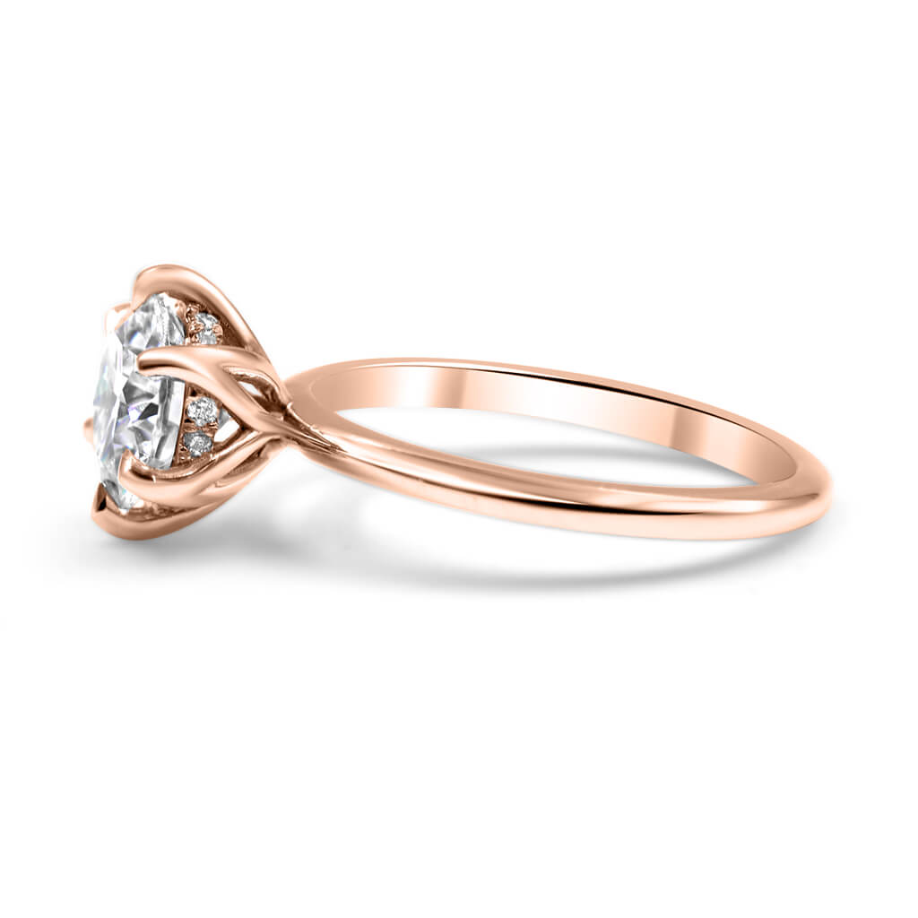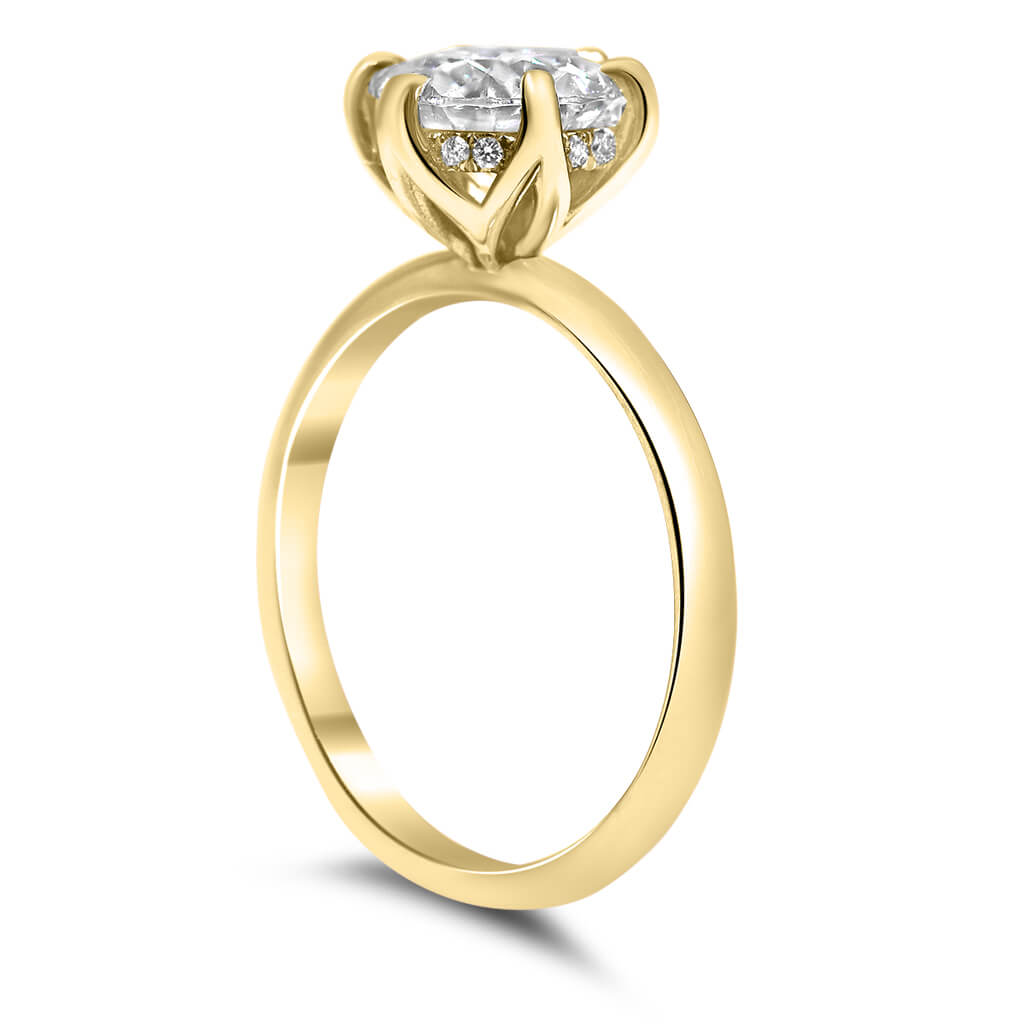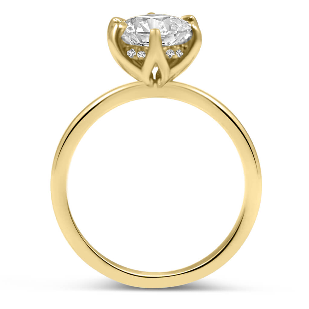 This beautiful setting features a custom six prong flower head with a hidden halo diamond halo, and a rounded style shank. You can't go wrong with this delicate design.