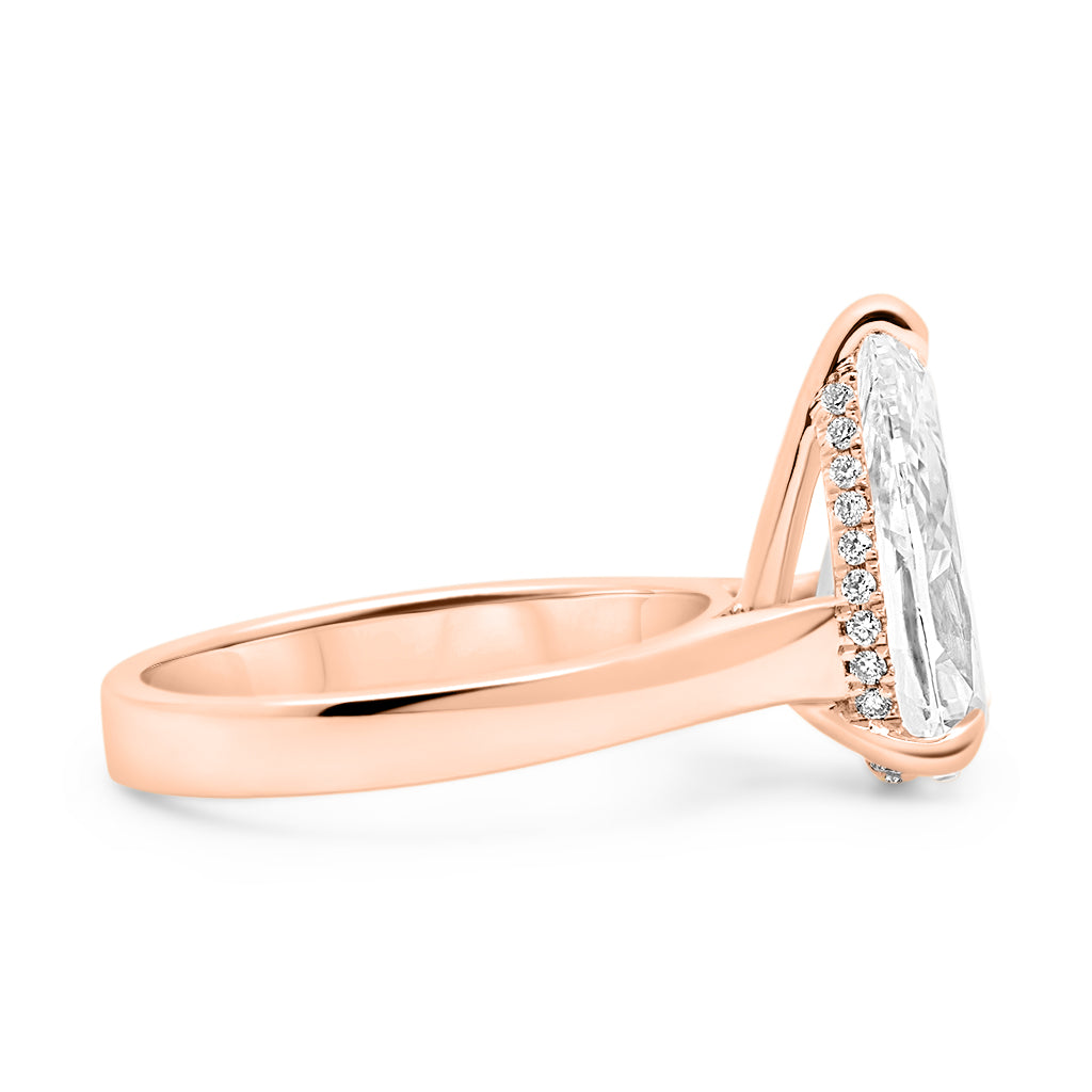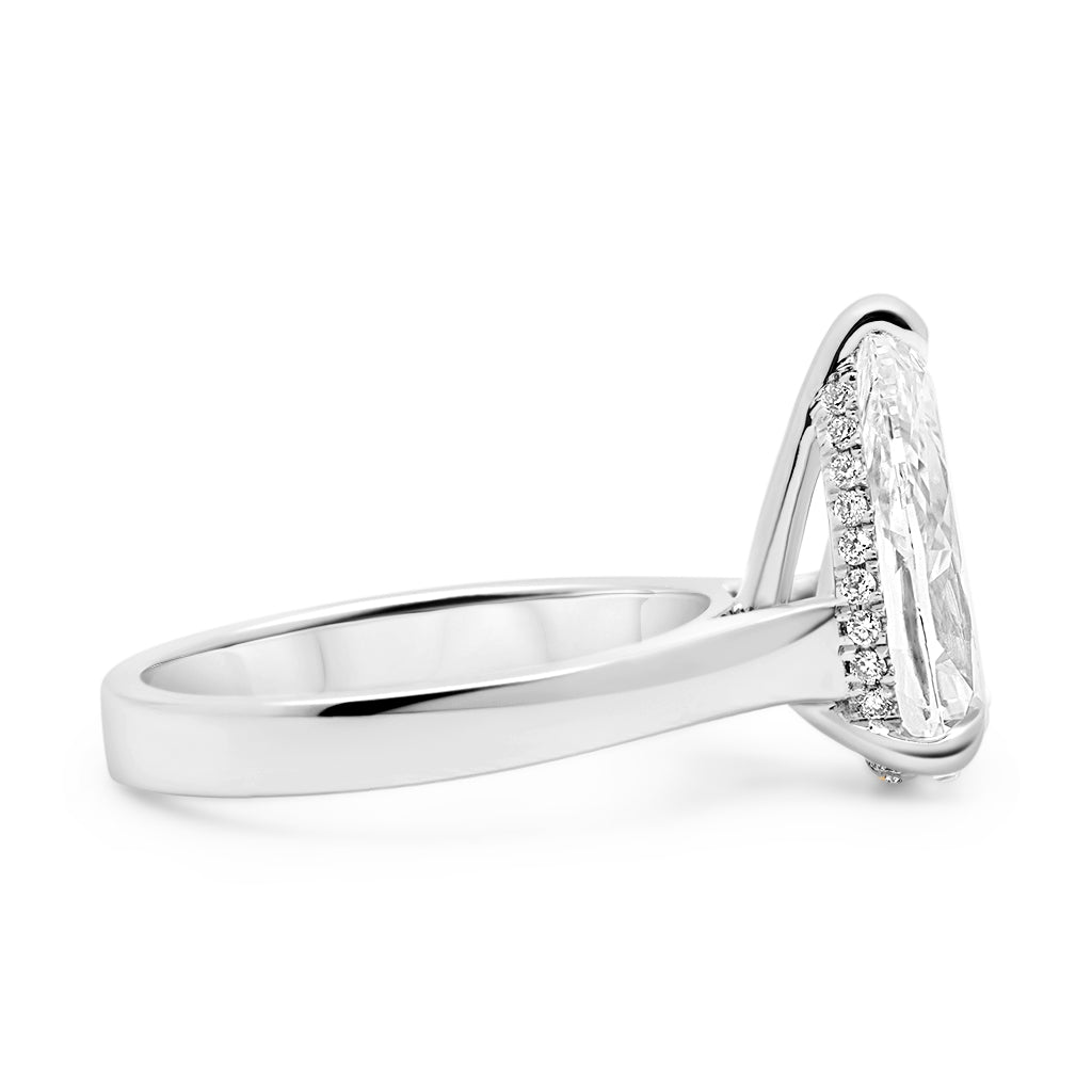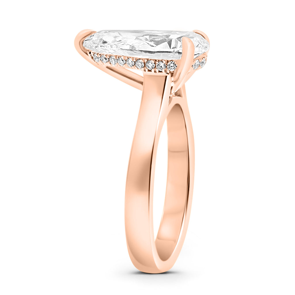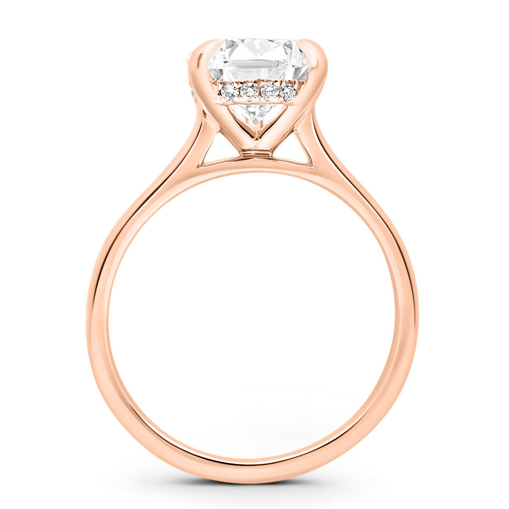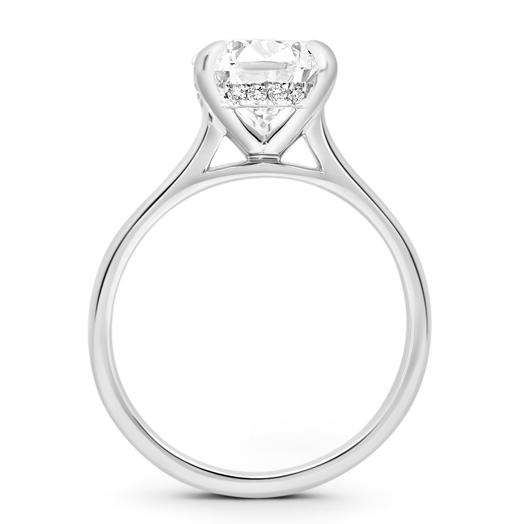 This beautiful engagement ring has a 3mm flat band with a cathedral and hidden halo. You can't go wrong with this classy design. It will always be timeless. Brides love this solitaire engagement ring because you can mix and match any women's wedding band for the perfect stack.