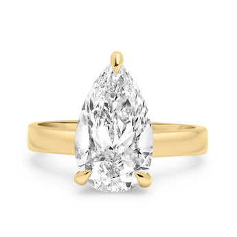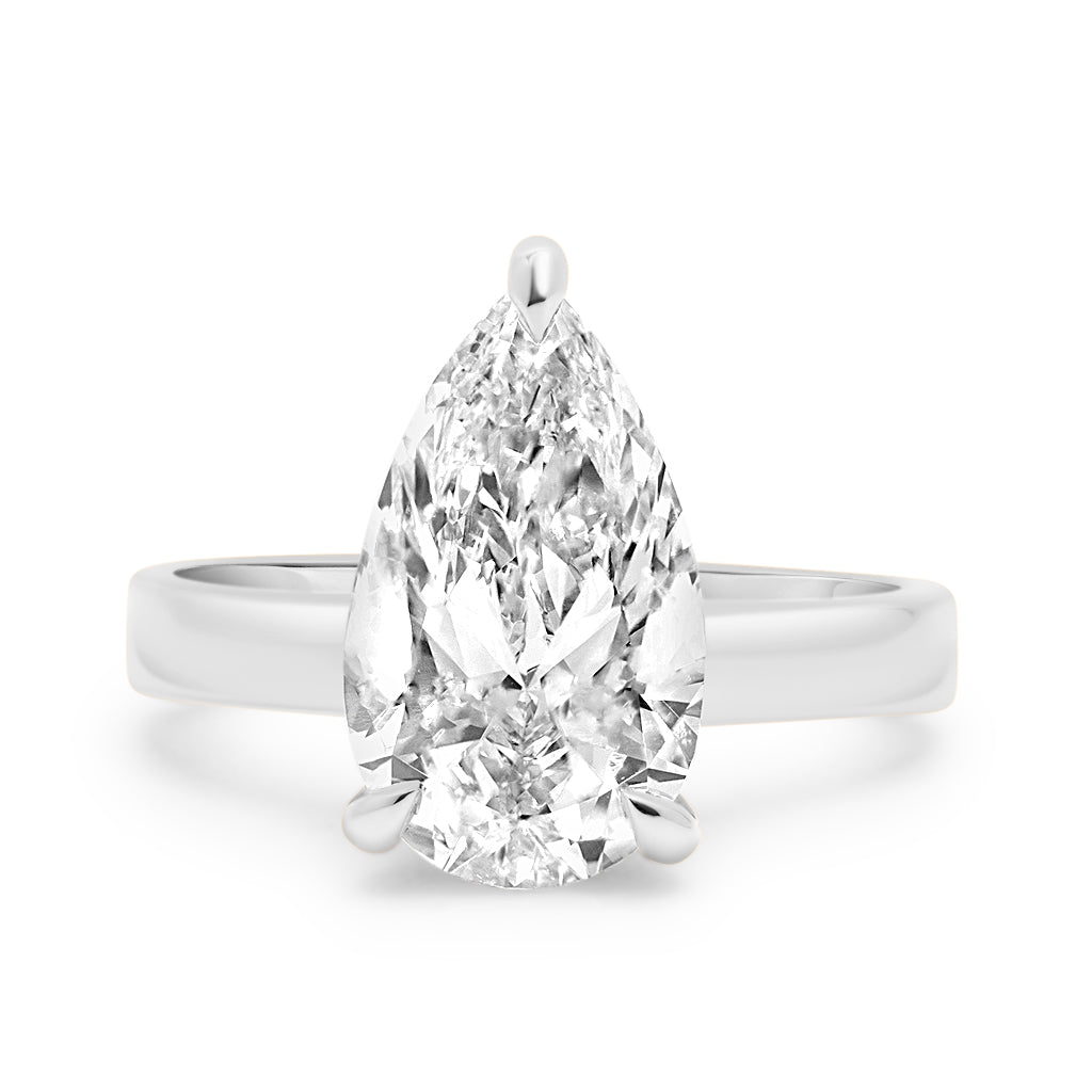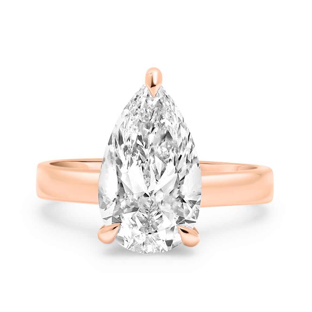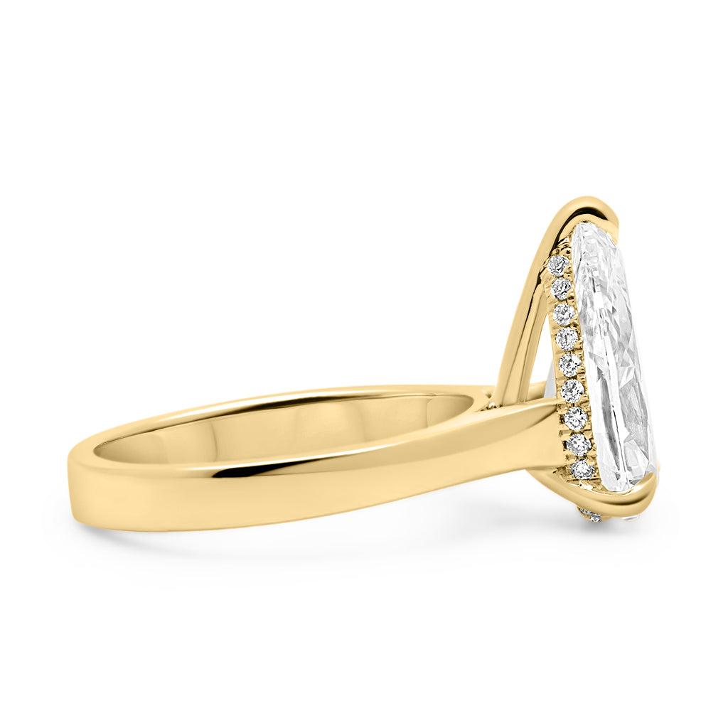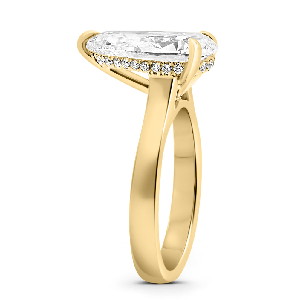 This beautiful engagement ring has a 3mm flat band with a cathedral and hidden halo. You can't go wrong with this classy design. It will always be timeless. Brides love this solitaire engagement ring because you can mix and match any women's wedding band for the perfect stack.