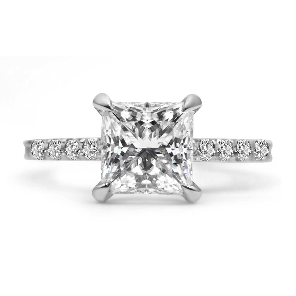 This beautiful setting is the one and only classic Princess engagement ring with lab grown diamond accent stones on the band. You can't go wrong with this delicate design. It will always be timeless. Brides love this ring because you can mix and match any wedding band with it. The attention is all on her, that one of a kind center stone in your ring. Perfect for our princess shape lovers!