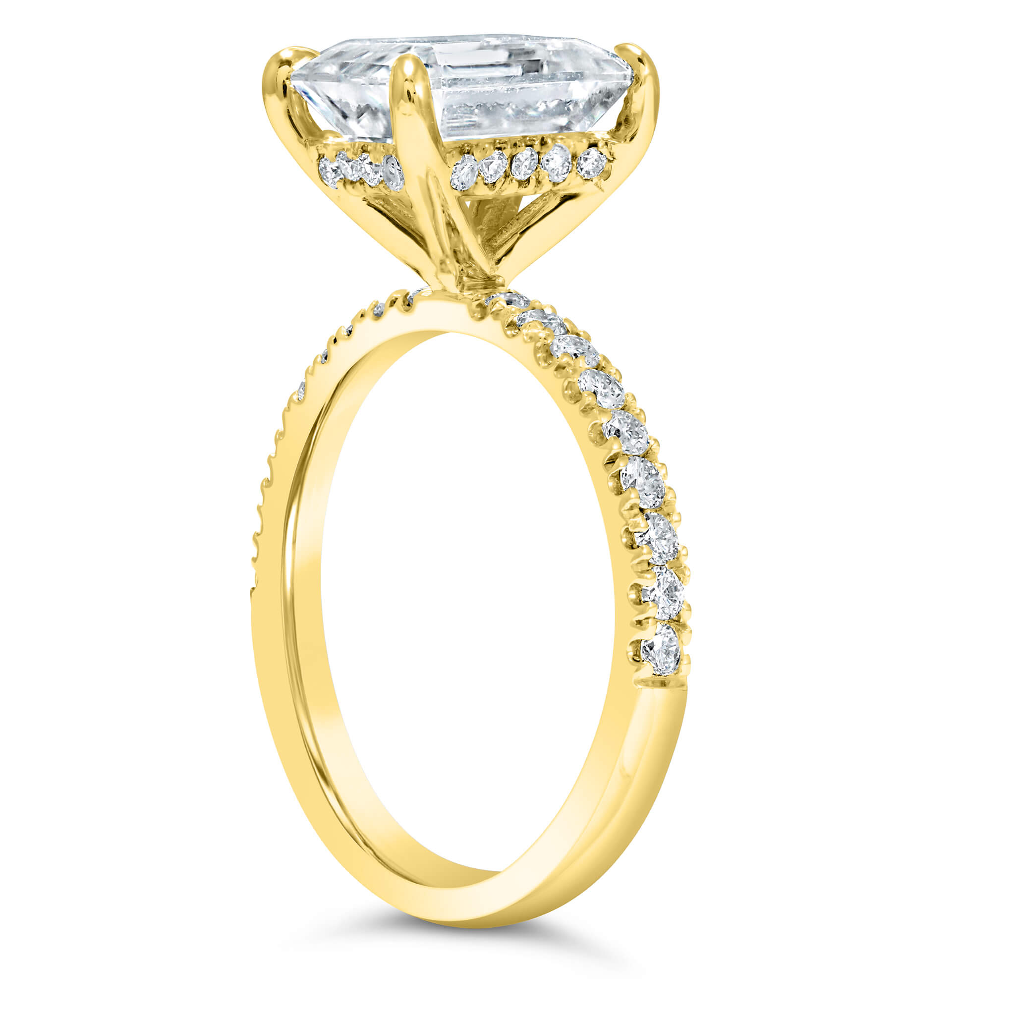 Delicate & timeless design. This unique engagement ring made with solid 14K gold features an emerald moissanite center stone, with a pave band and a hidden halo. You can't go wrong with such a timeless piece! Brides love this ring because you can mix and match any wedding band with it. The attention is all on her, that one-of-a-kind center stone in your ring. Perfect for our emerald shape lovers!