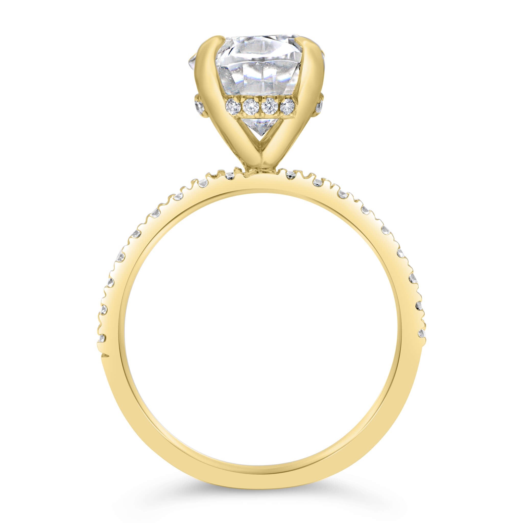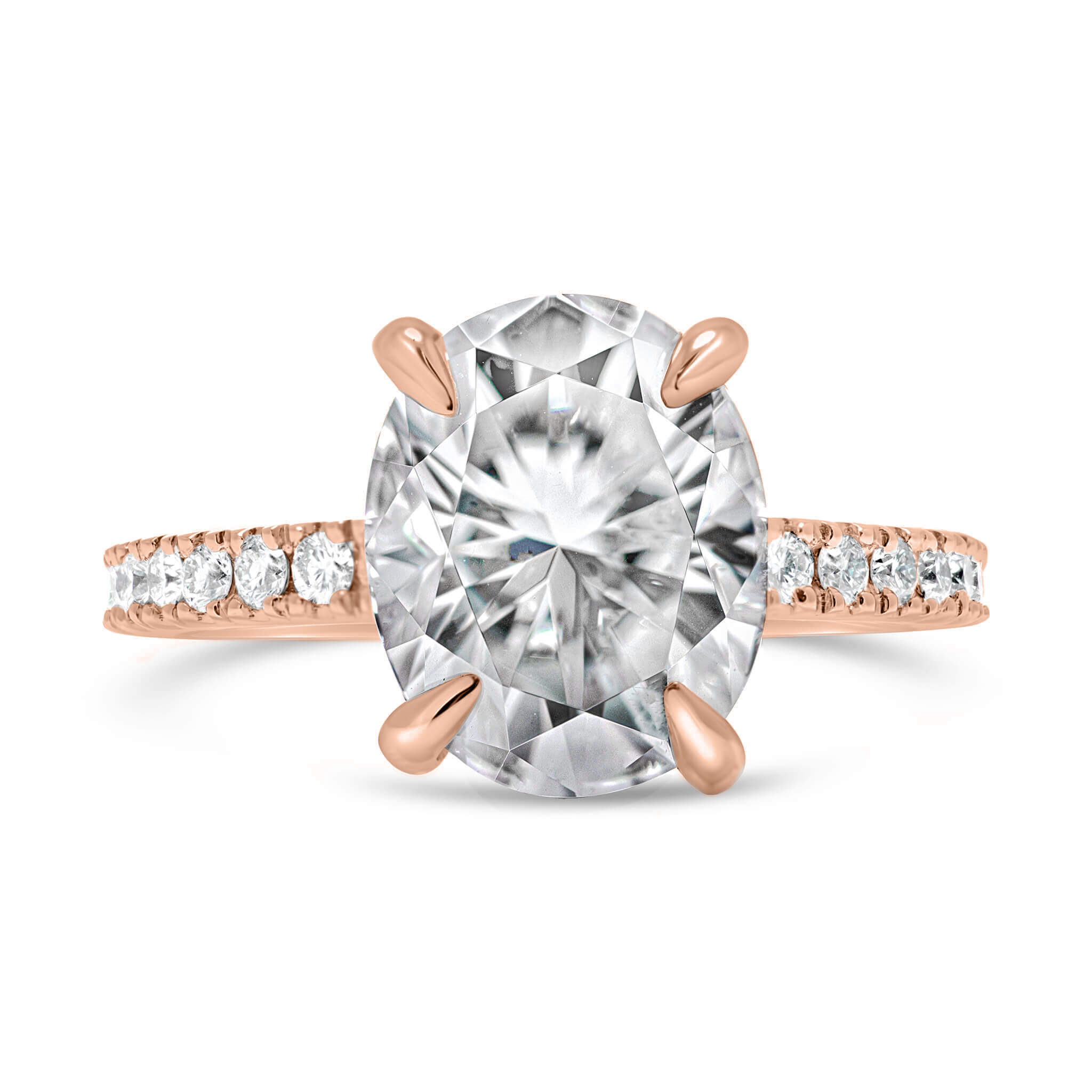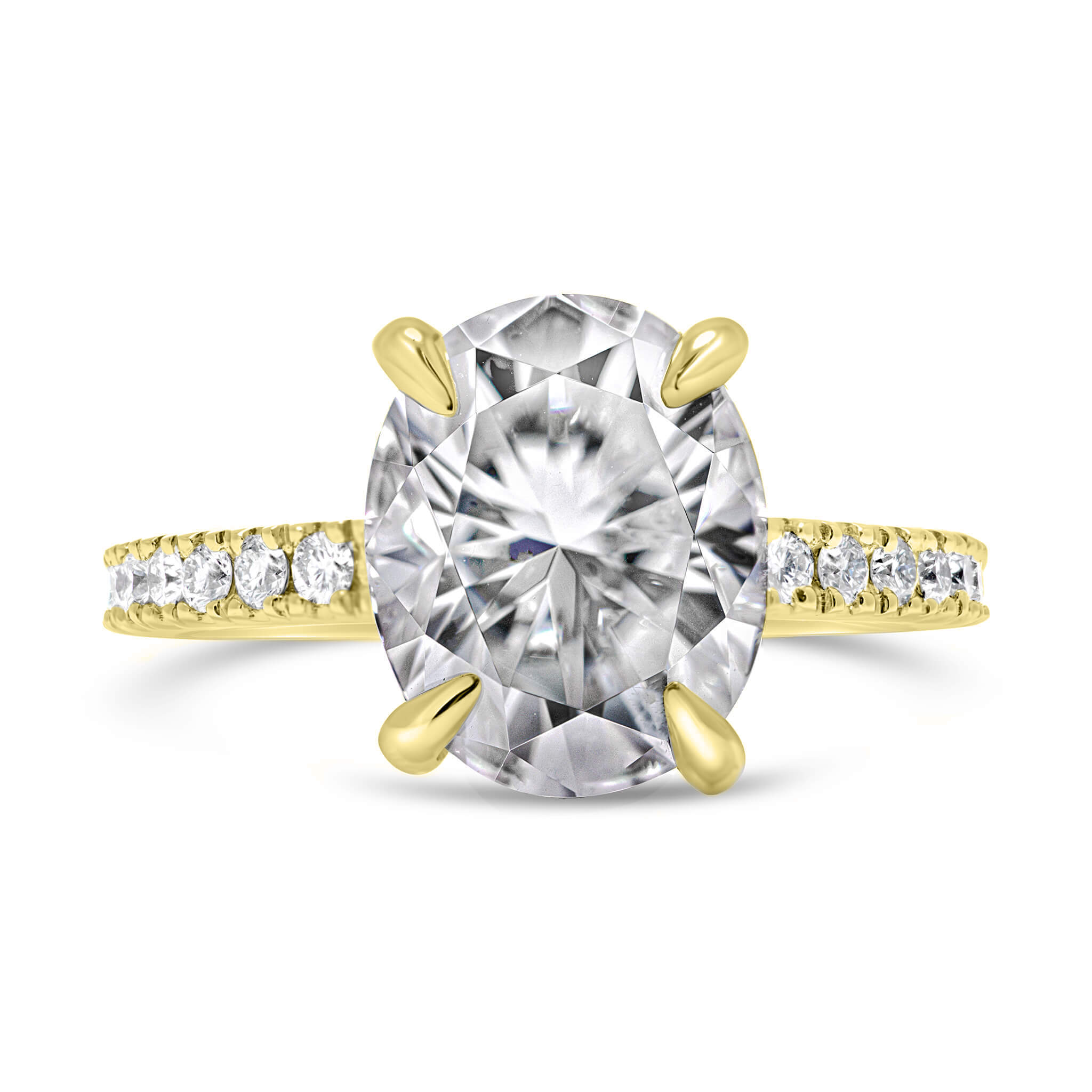 This unique engagement ring made with solid 14K gold features an oval moissanite center stone, with a pave band and a diamond hidden halo. Choose any gold color & stack any wedding band for the perfect bridal stack. You can't go wrong with such a timeless piece. Perfect for our oval shape lovers!