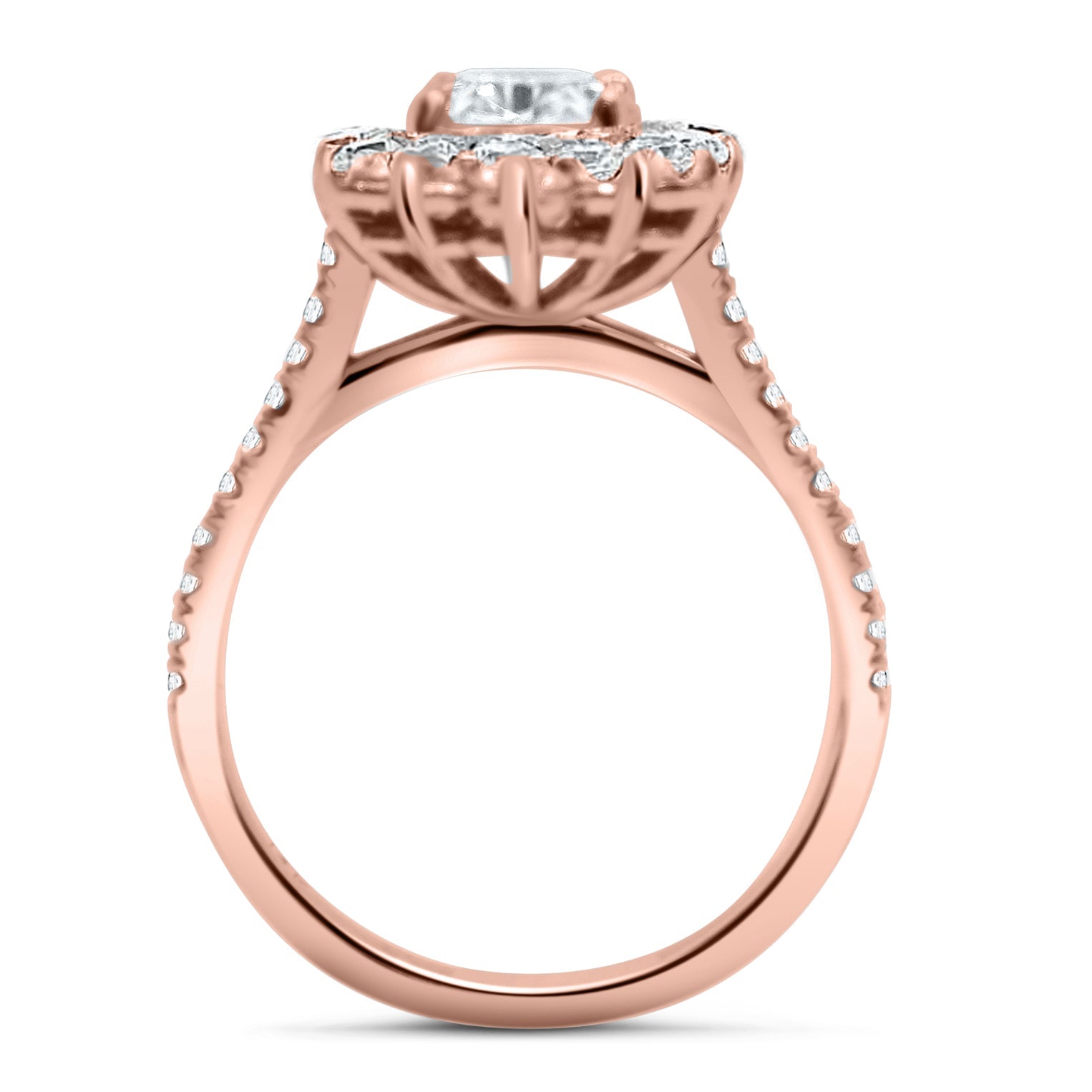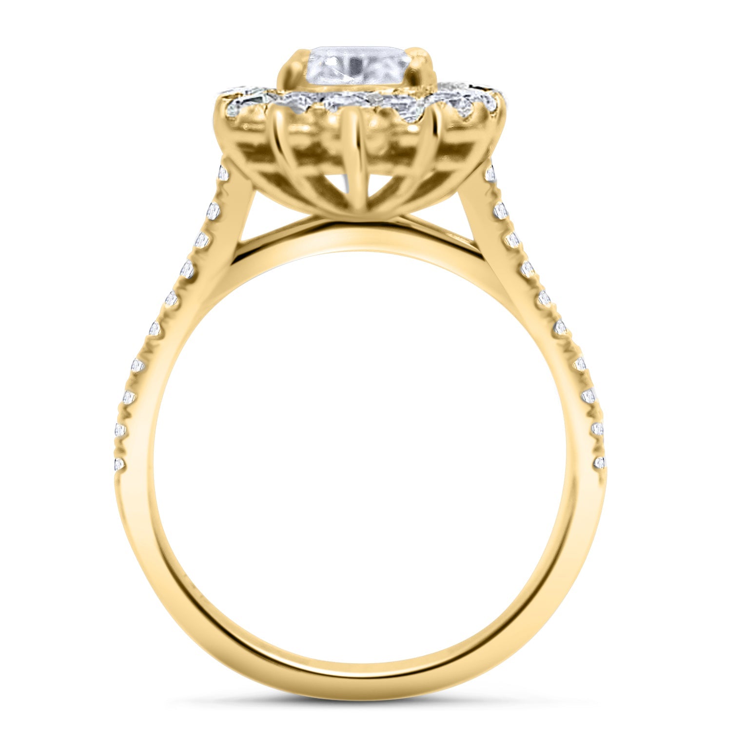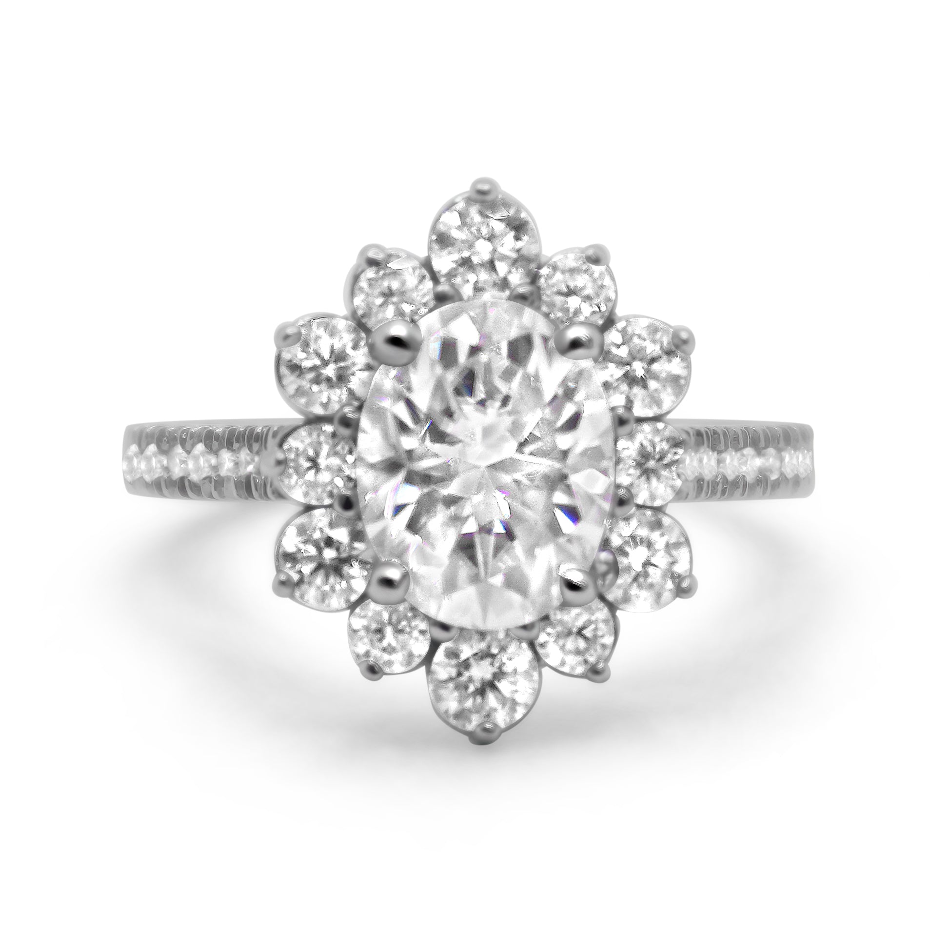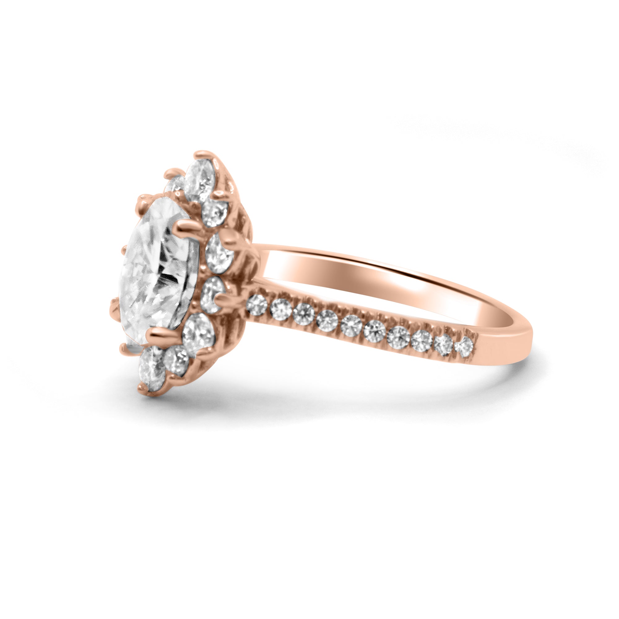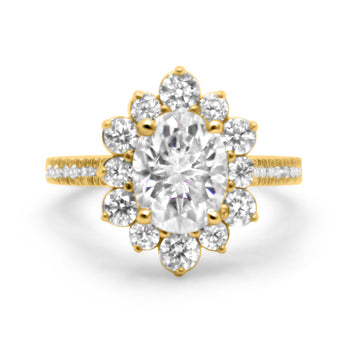 This unique engagement ring features an Oval moissanite center stone with a moissanite halo & accent moissanites on the bridge of the shank, all in 14K gold. You can't go wrong with this style, it is such a modern look. Perfect for our oval lovers! Brides love this ring because you can mix and match any wedding band for the perfect stack.