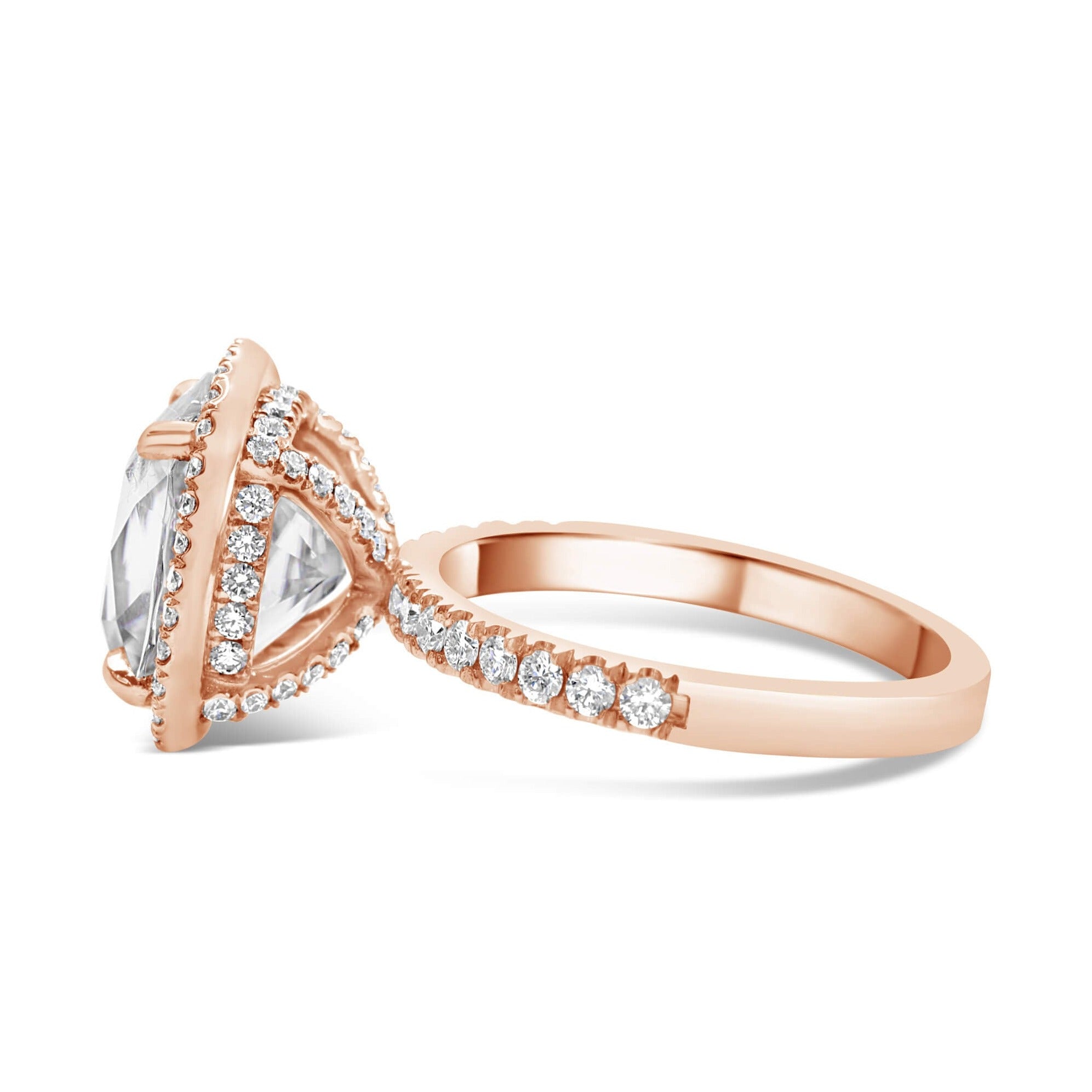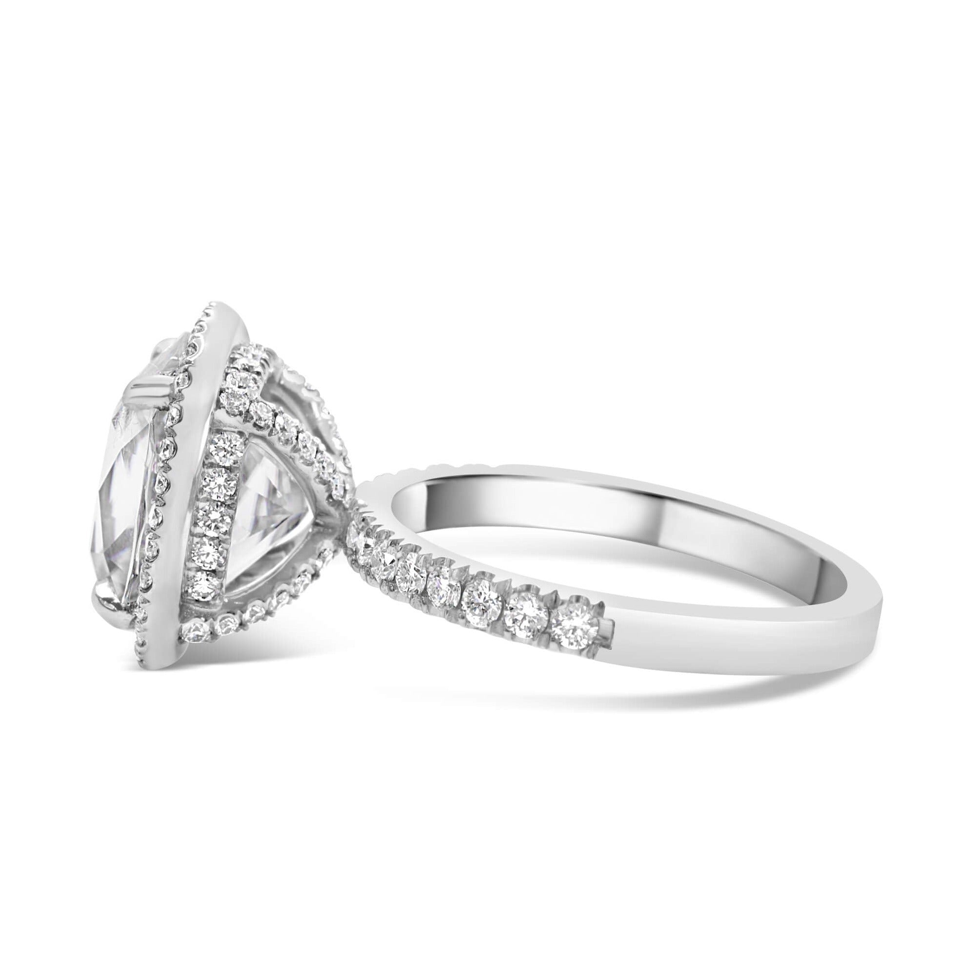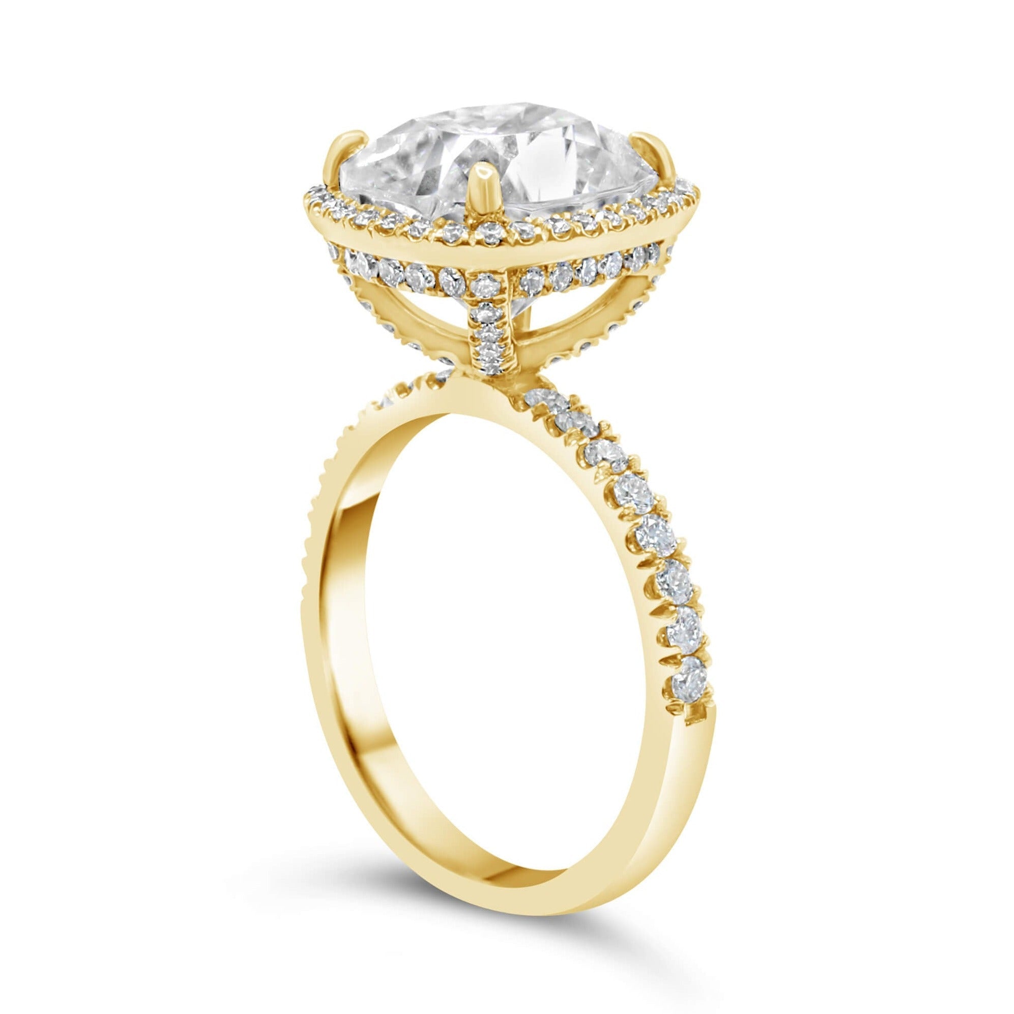 This beautiful setting is the one and only classic elongated cushion engagement ring that features a halo around the center stone and a hidden halo with accent diamonds on the shank.