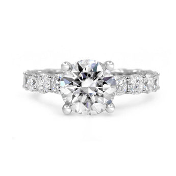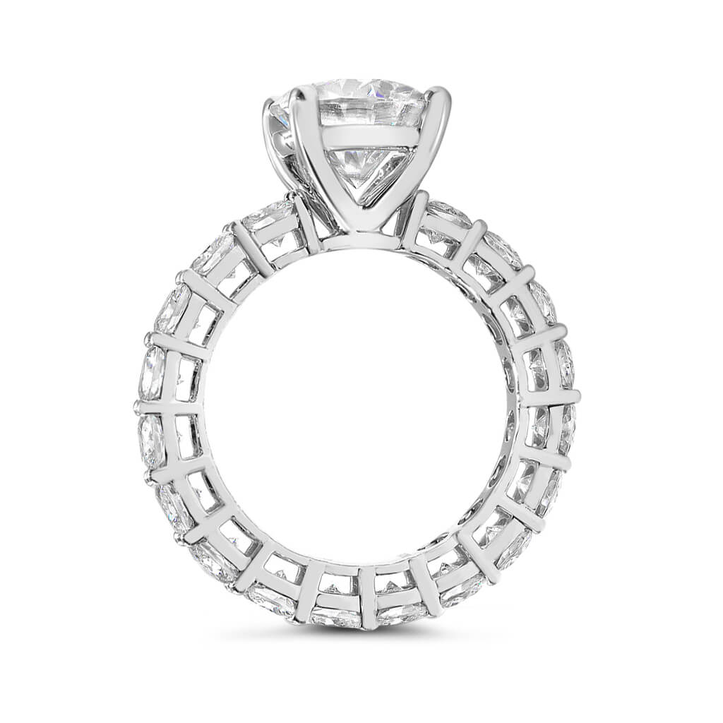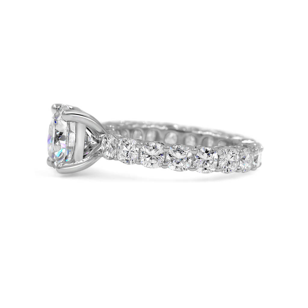 This ring features a round Moissanite center stone with an eternity cushion moissanite stones in 14K white gold. You can't go wrong with this style, it is such a timeless look.