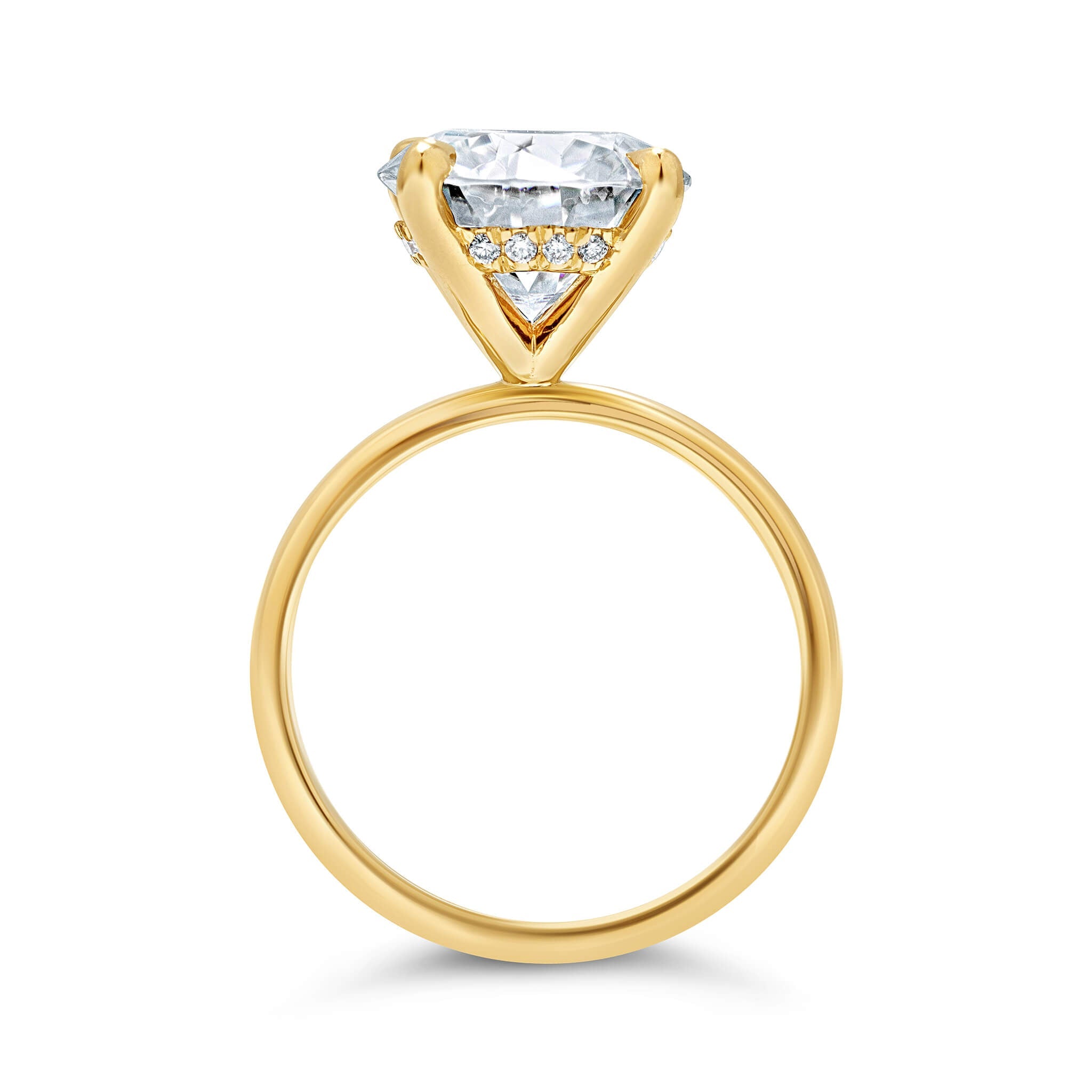 Meet our beautiful 14K gold hidden halo engagement ring with the one and only classic Round stone. You can't go wrong with this delicate design. It will always be timeless. Brides love this ring because you can mix and match any women's diamond wedding band & women's moissanite wedding bands with it. The attention is all on her, that one-of-a-kind center lab grown diamond or moissanite in your ring. Perfect for our round shape lovers!