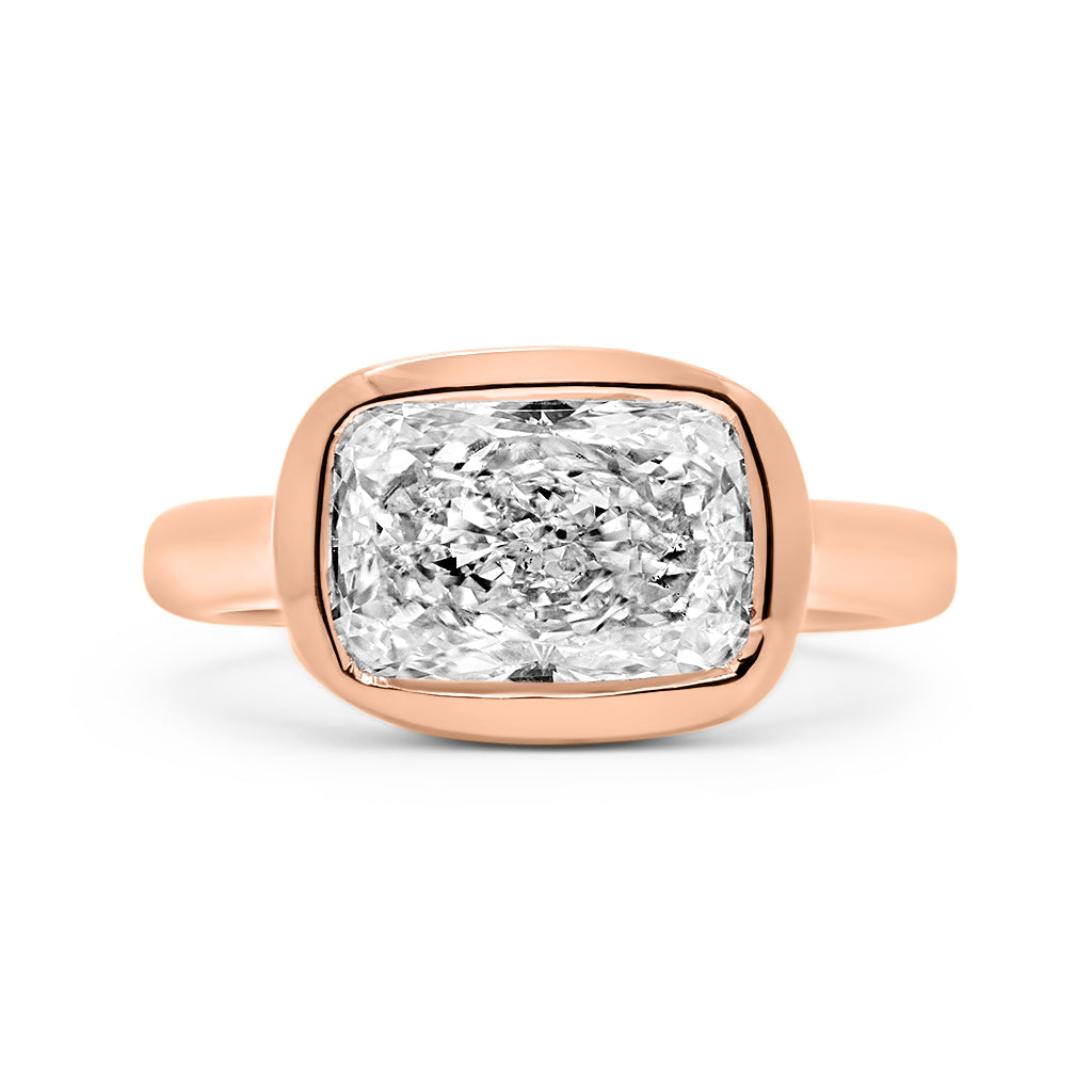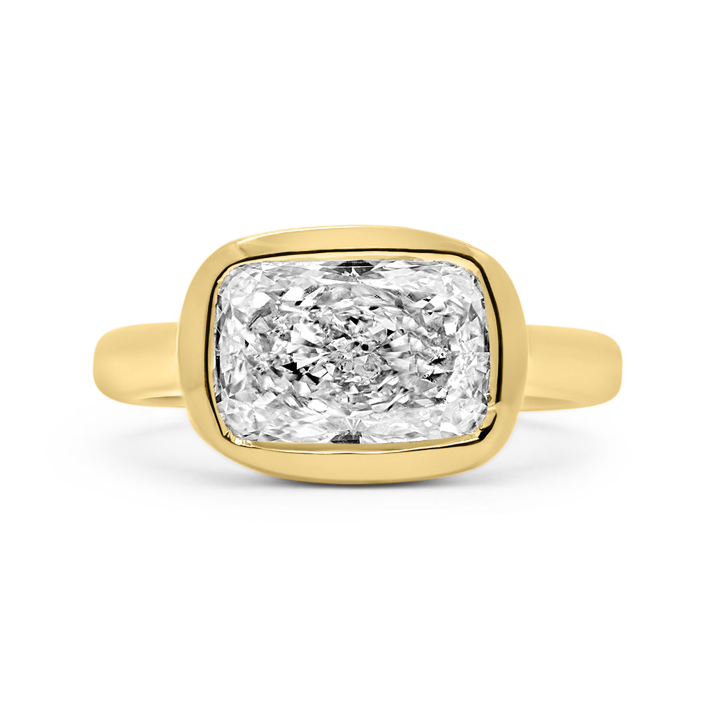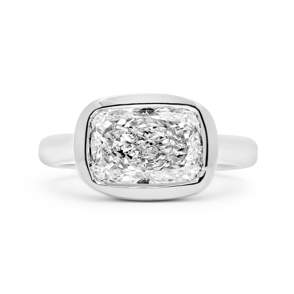 This beautiful engagement ring is in a east-west style, set in a bezel style design. It will always be timeless.